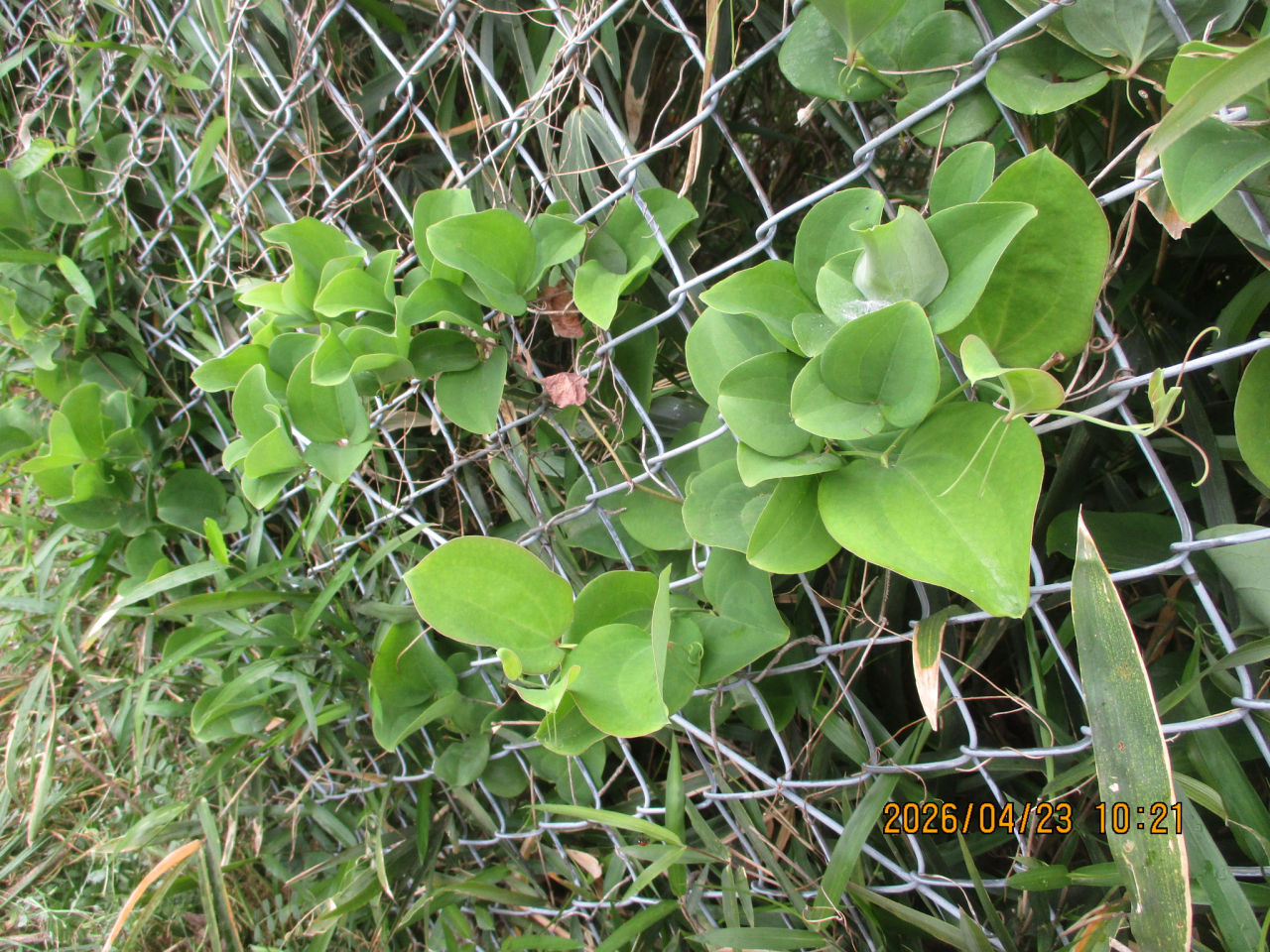 第三京浜側のフェンスに絡んでいる葉っぱです。四国では「ボッテンシバ」と呼んで今頃の季節にヨモギ餅を柏餅のようにこのボッテンシバの葉に包んで食べるそうです。この葉、関東では何と呼ぶのでしょうか?