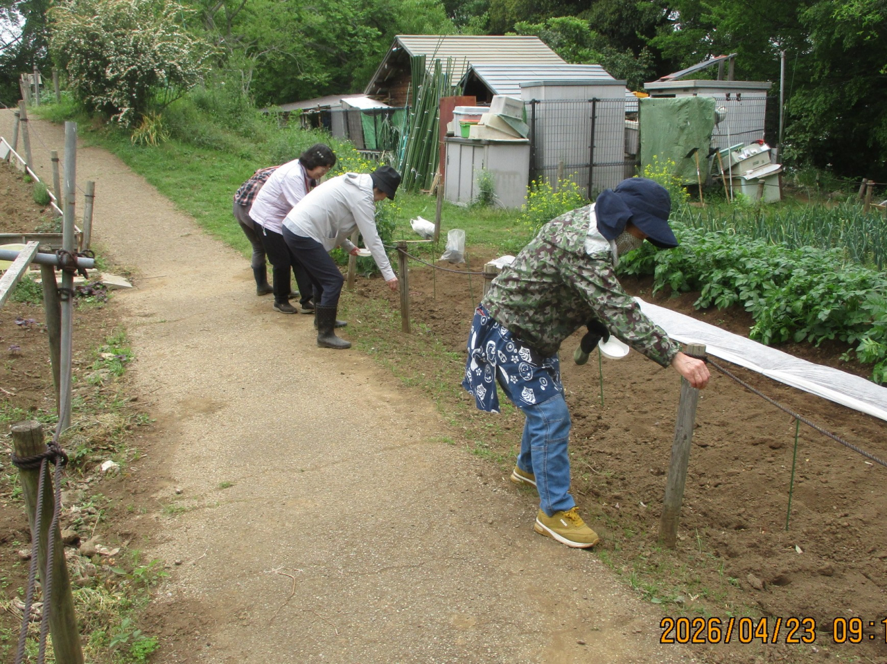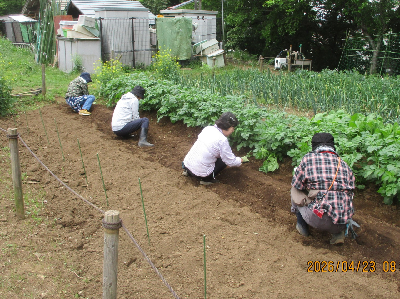 園農部会では枝豆の種蒔き、遊歩道との境目には虫除けになるというマリーゴールドの種蒔きです。