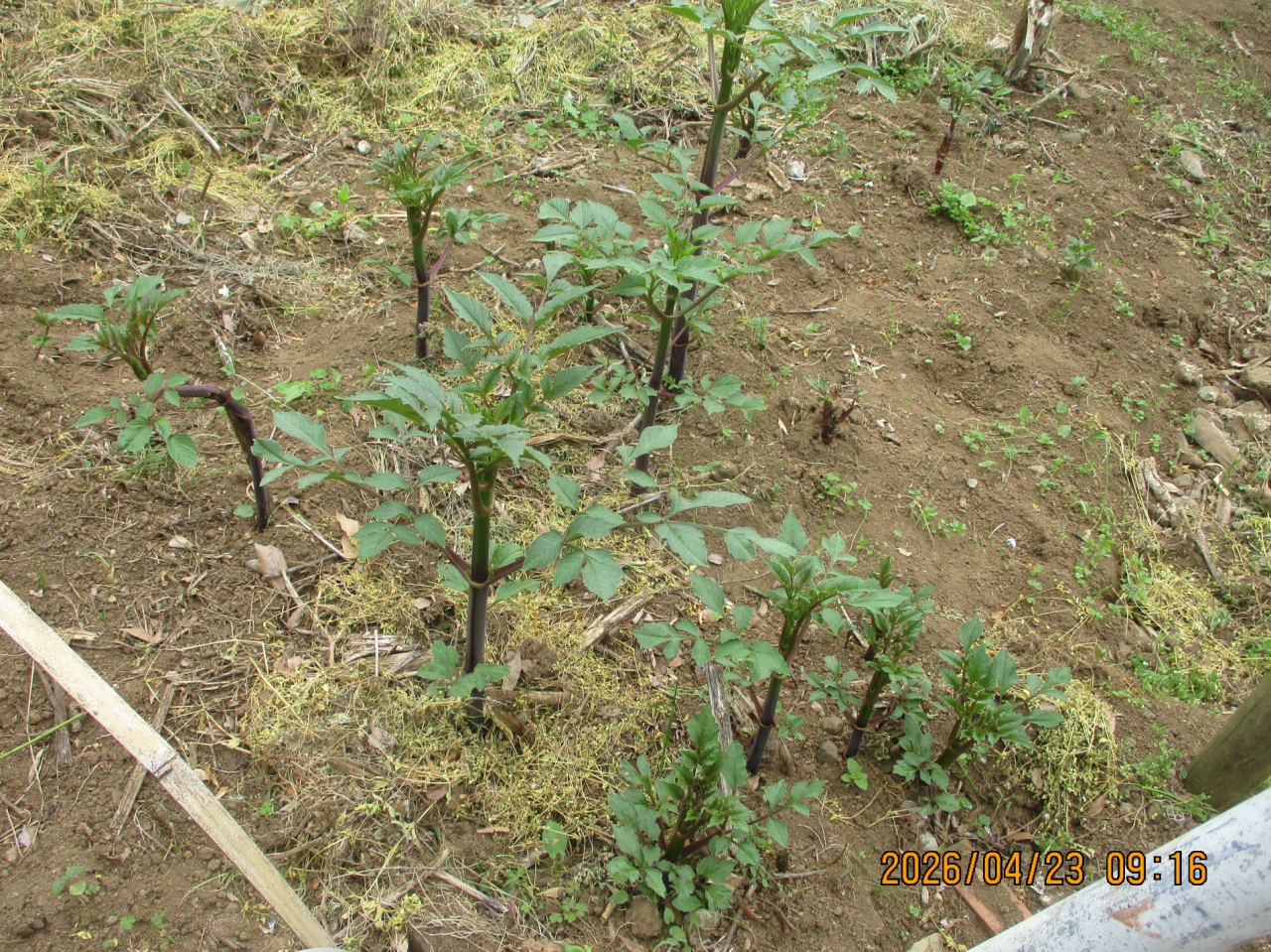 11月末から12月にかけて大きな花を咲かせて楽しませてくれる「皇帝ダリア」、今年も花を付けてくれるでしょう。芽が出て大きくなってきました。