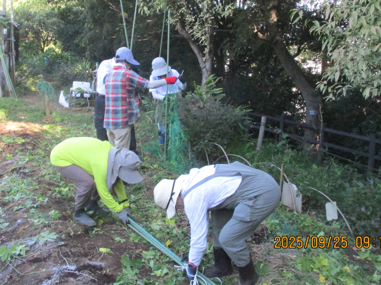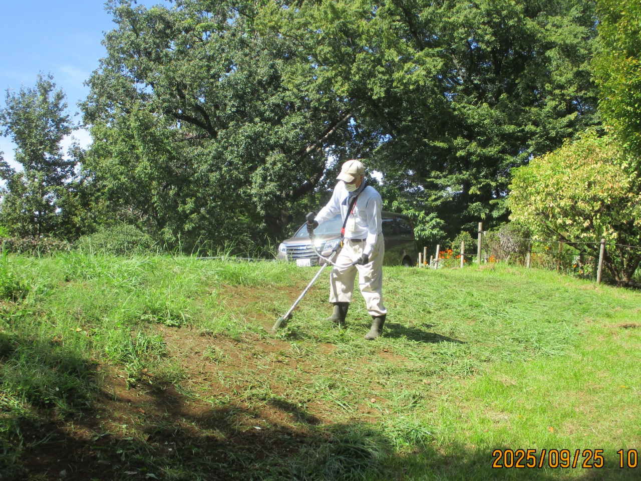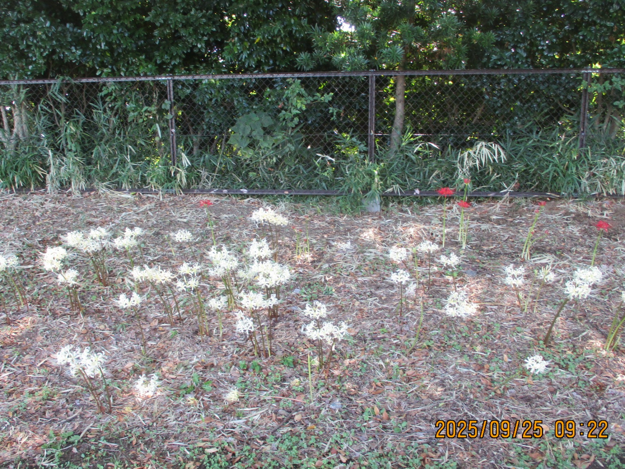 「暑さ寒さも彼岸まで」のことわざ通りやっと猛暑から抜けたようです。とはいえ動くと少し汗ばむ程度には暑さが残る活動日です。今年も彼岸花が咲き始めましたが例年と違い四阿の奥では赤い彼岸花が少なく白い彼岸花が優勢です。毎年ほぼ同じ場所に咲きますがこんなことは初めてです。