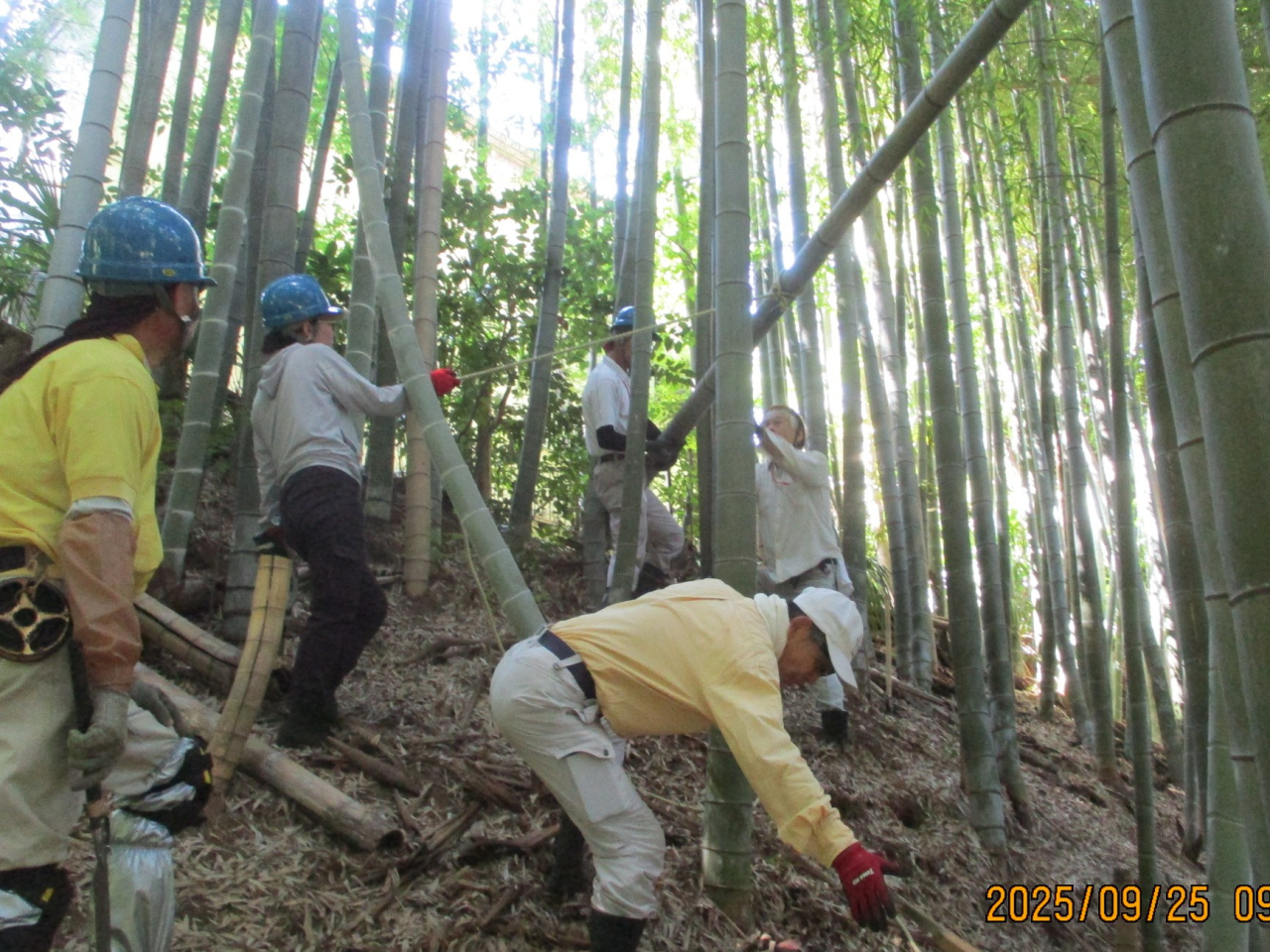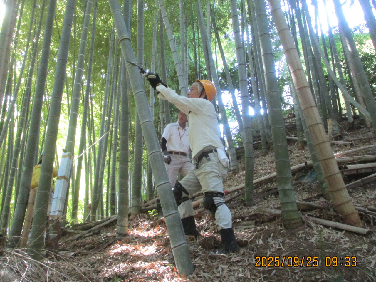 10月予定の炭焼き用に竹林整備を兼ねてふれあいの森の竹林で竹の間伐です。今回は斜面のかなり上部の竹を選びましたので切り出しが大変でした。切った際に周りの竹が邪魔になりすぐには倒れてくれないのでその場で軽トラサイズに切って少しずつ短くして運び出しました。今回は人手が少なく竹切に参加された皆さんはかなり大変な作業となりました。ご苦労様でした。