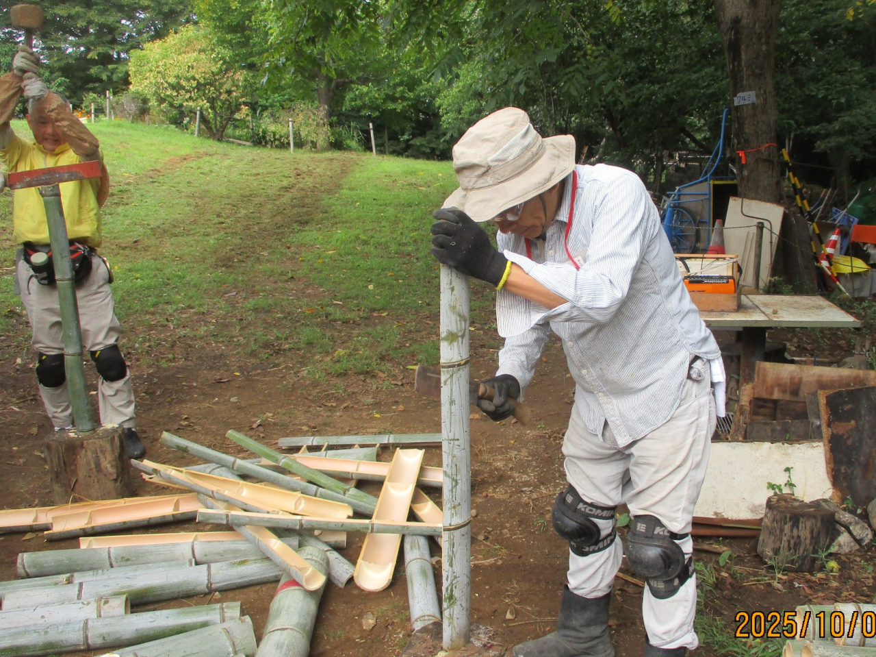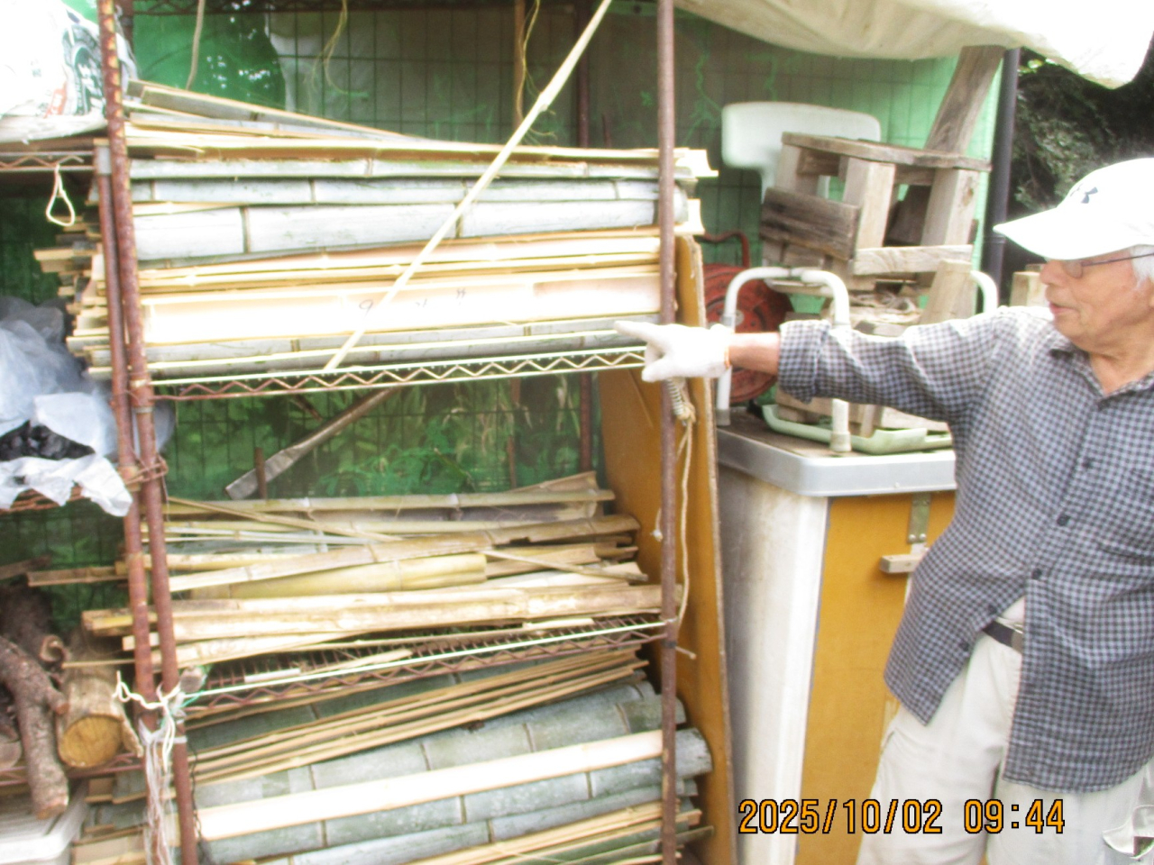 先週、時間の関係で出来なかった節取りです。5本分ほどの竹を来週窯詰、再来週炭焼きで利用することとなります。炭焼き時は丸竹や梅枝も一緒に焼くことになるようです。