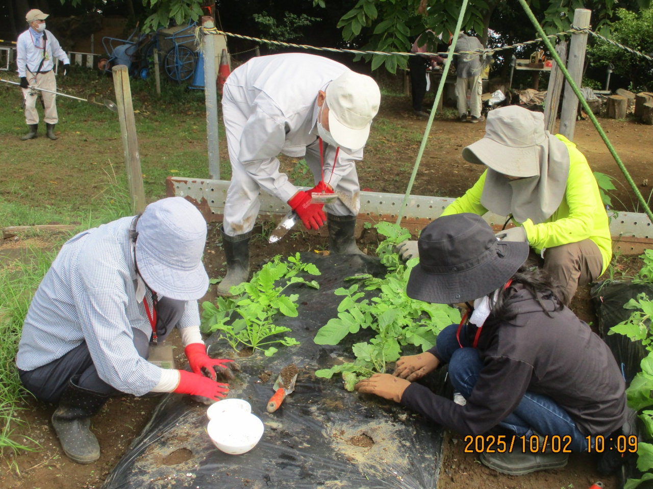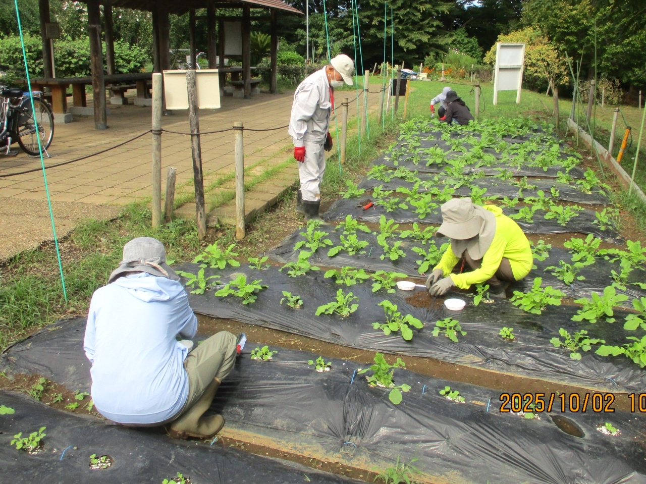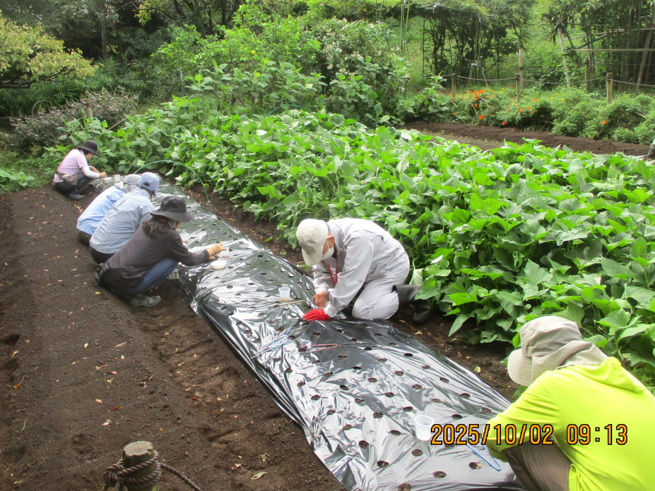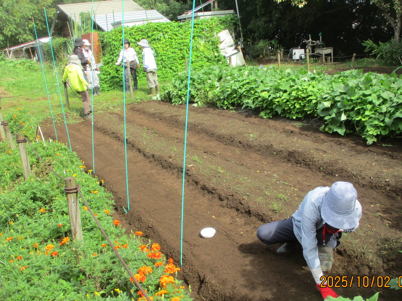先週撤収したモロヘイヤの跡地に早速タマネギの種まきです。小さな種を女性会員中心となり丁寧に蒔いてくれました。春菊はまず畝をならした後に種まきです。
