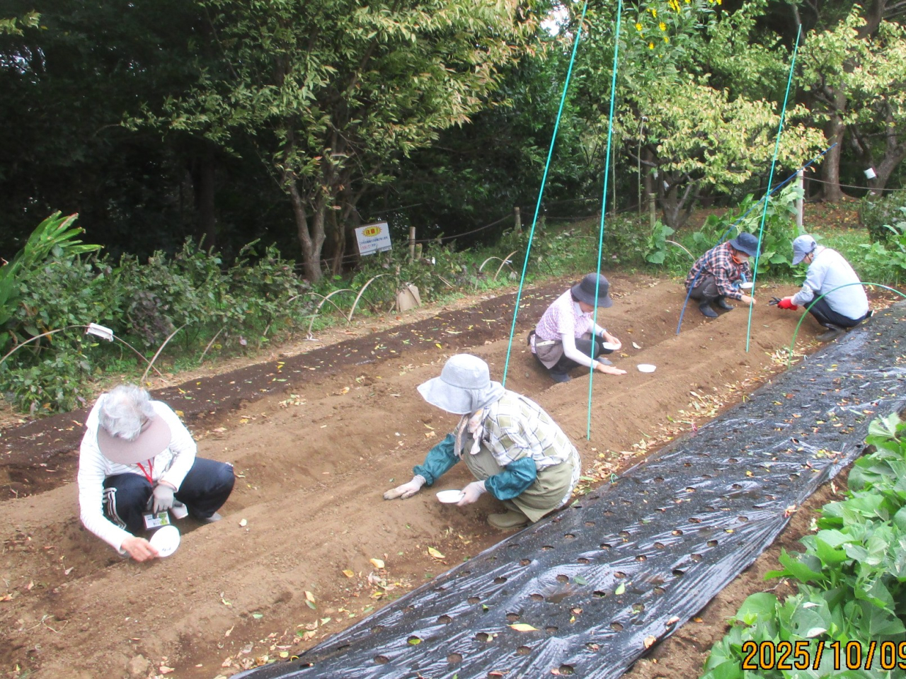 園農部会ではモロヘイヤ撤収の跡地に小松菜の種まきです。先週蒔いた春菊とよく似た小さな種です。春菊は芽が出ています。ジャガイモ畑の手入れで草取りも実施です。