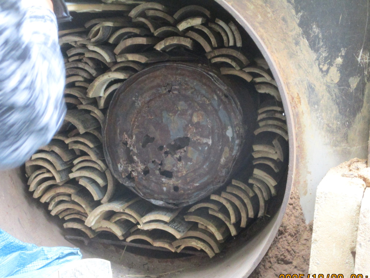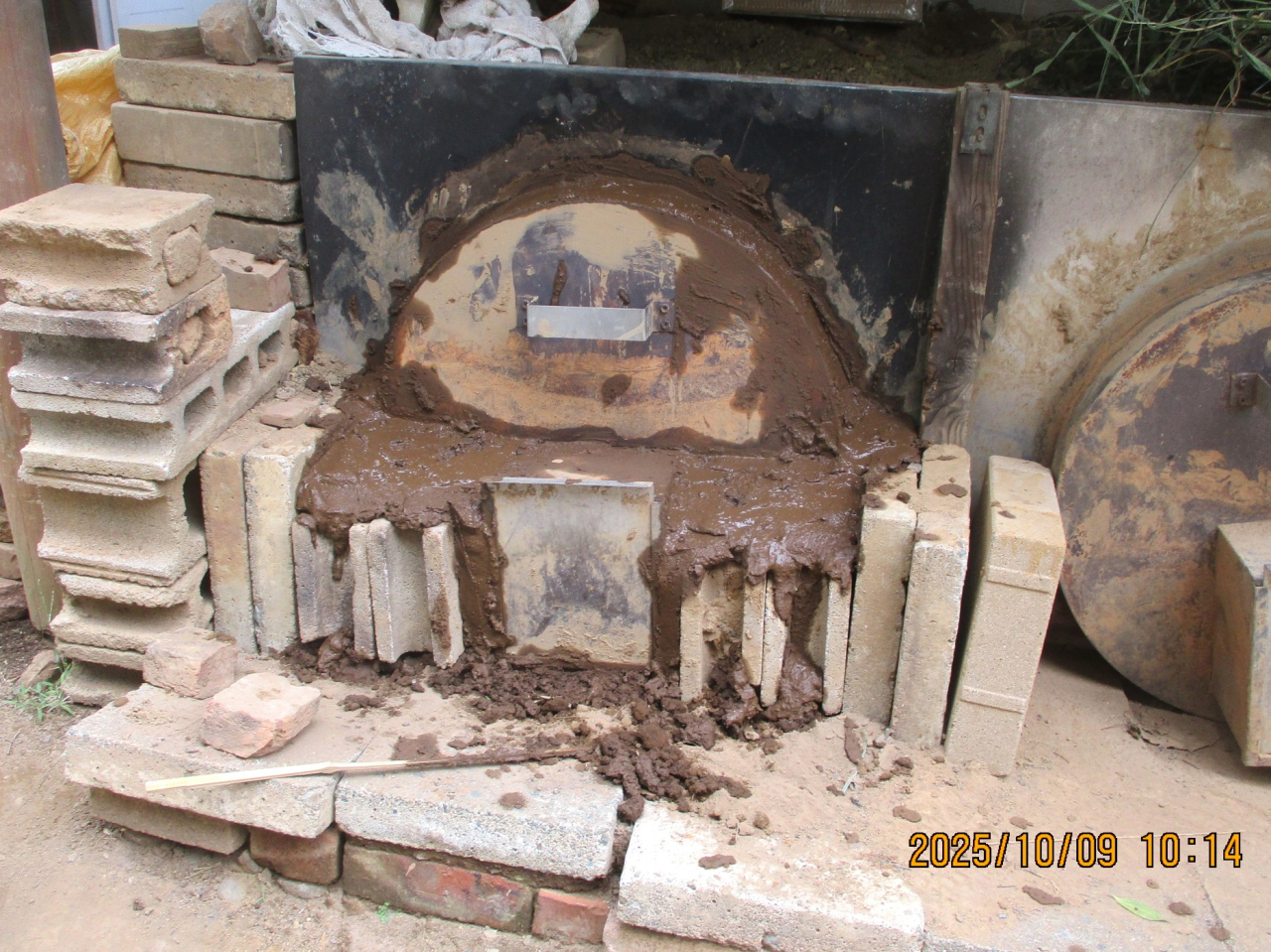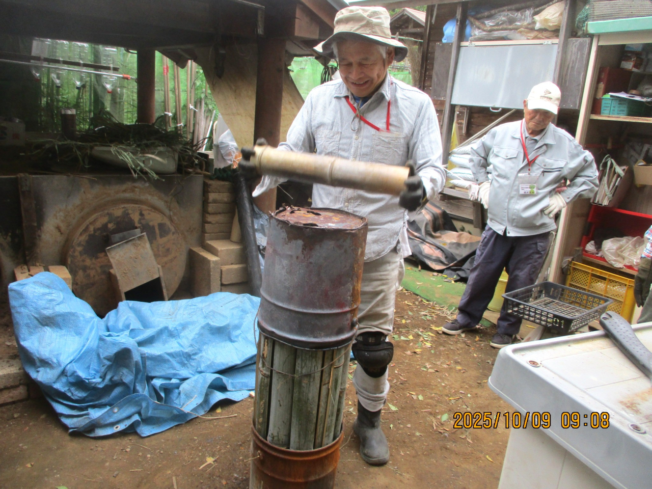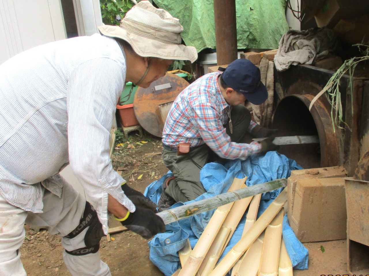 来週16日予定の炭焼きに向けて窯詰です。今回も丸竹もいれて焼きますが型崩れしないで焼けるような工夫があります。丸竹をまとめてその上下をペール缶で押さえてみました。上手く行くか楽しみです。大橋さんも窯詰で活躍頂けました。