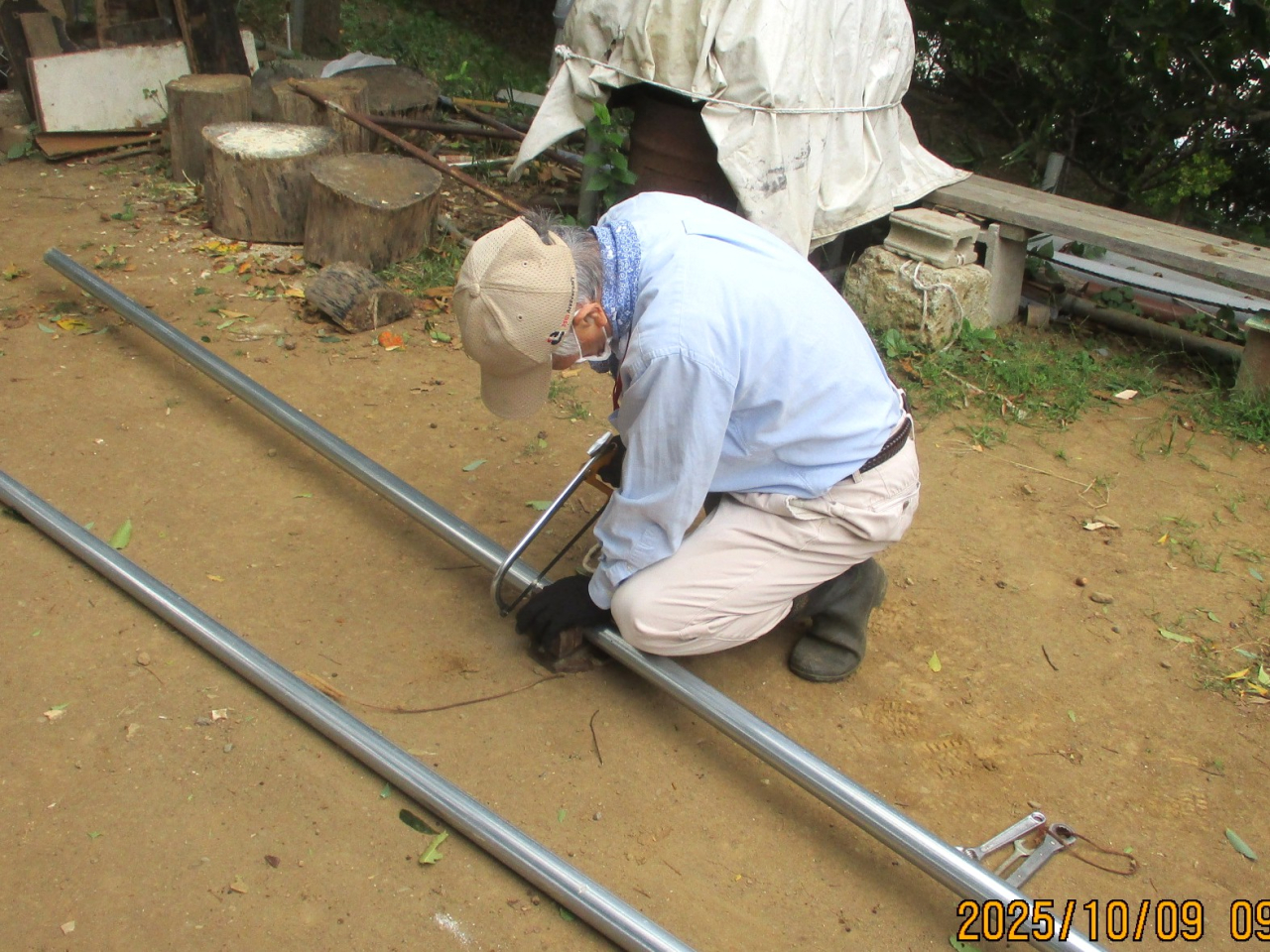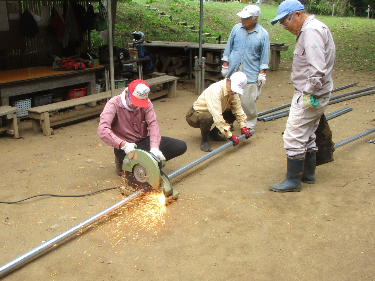北側の急斜面の手作り階段、木の杭では無理があり、スチールのパイプを使って作り直します。まずはパイプの切断から。手動で切るのは大変です。電動ノコでは火花が盛大に散り花火の感じです(笑)