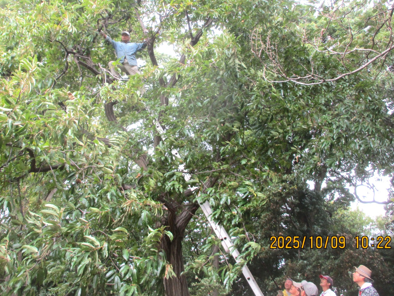 栗は下の方は落ちてしまっていたので上方の栗を梯子を使って落してもらいました。栗拾いというよりは栗落としの方がメインです。