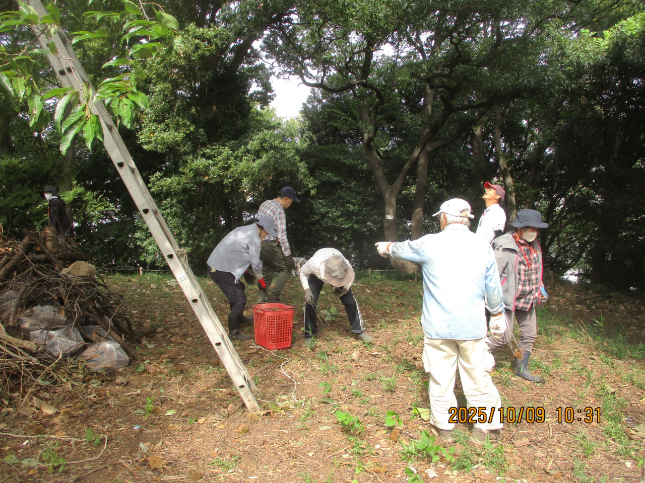 数日前は台風の影響で本日は休みかなと思ったのが予報よりは南にそれたようでちょうどいい気温の活動日となりました。本日は里山支援金助成でお世話になっている三菱UFJ環境財団の大橋さんが視察方々お手伝いに来てくれました。会長副会長と右端が大橋さん。