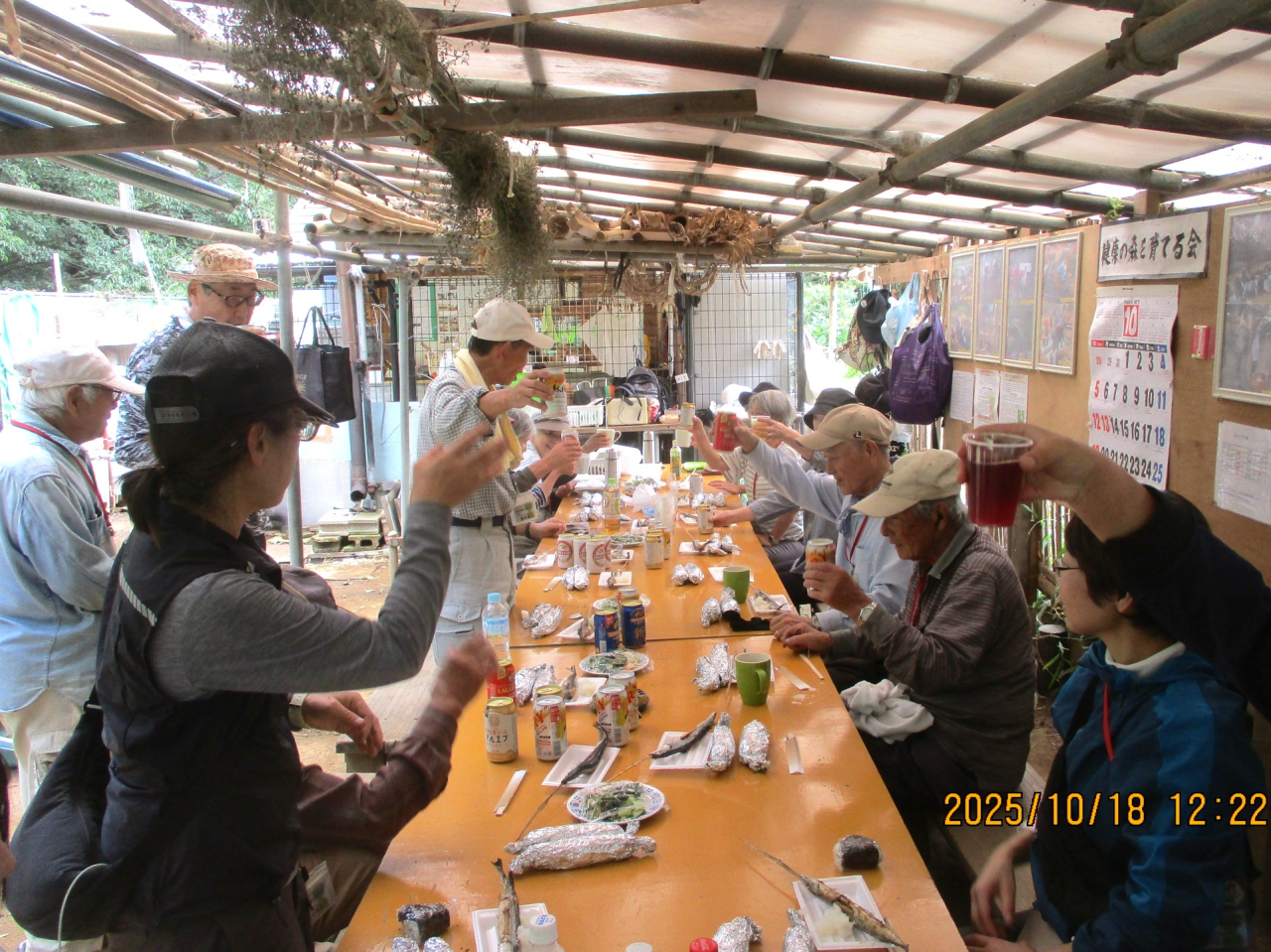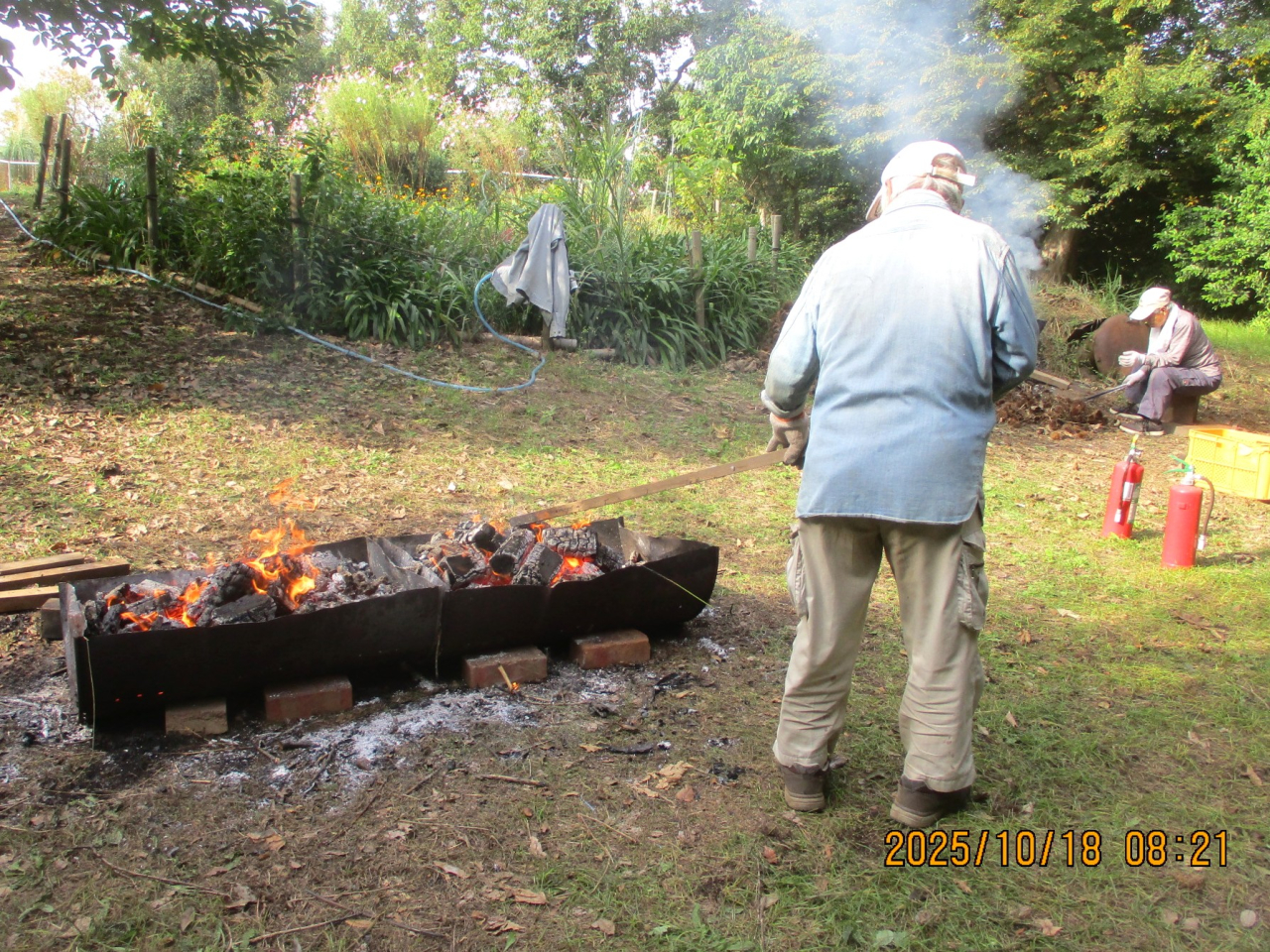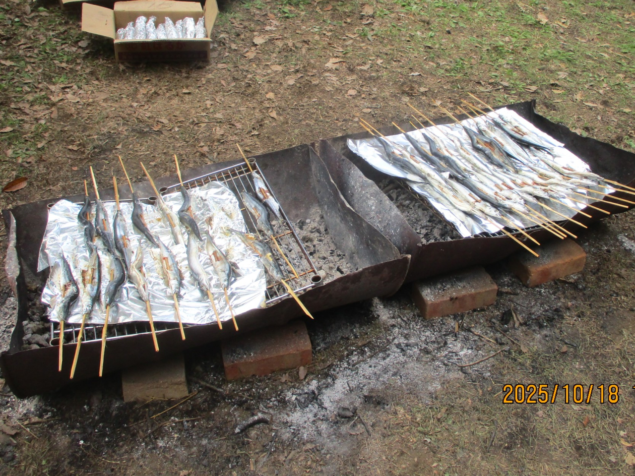 焼き芋用の熾火を使って今年もサンマを焼きました。サツマイモ堀り終了後には手伝ってくれた会員に加えて高校生も一緒に昼食会です。焼き芋にサンマ、女性会員から差し入れの漬物を皆で堪能しました。参加した会員の皆様、お疲れ様でした。