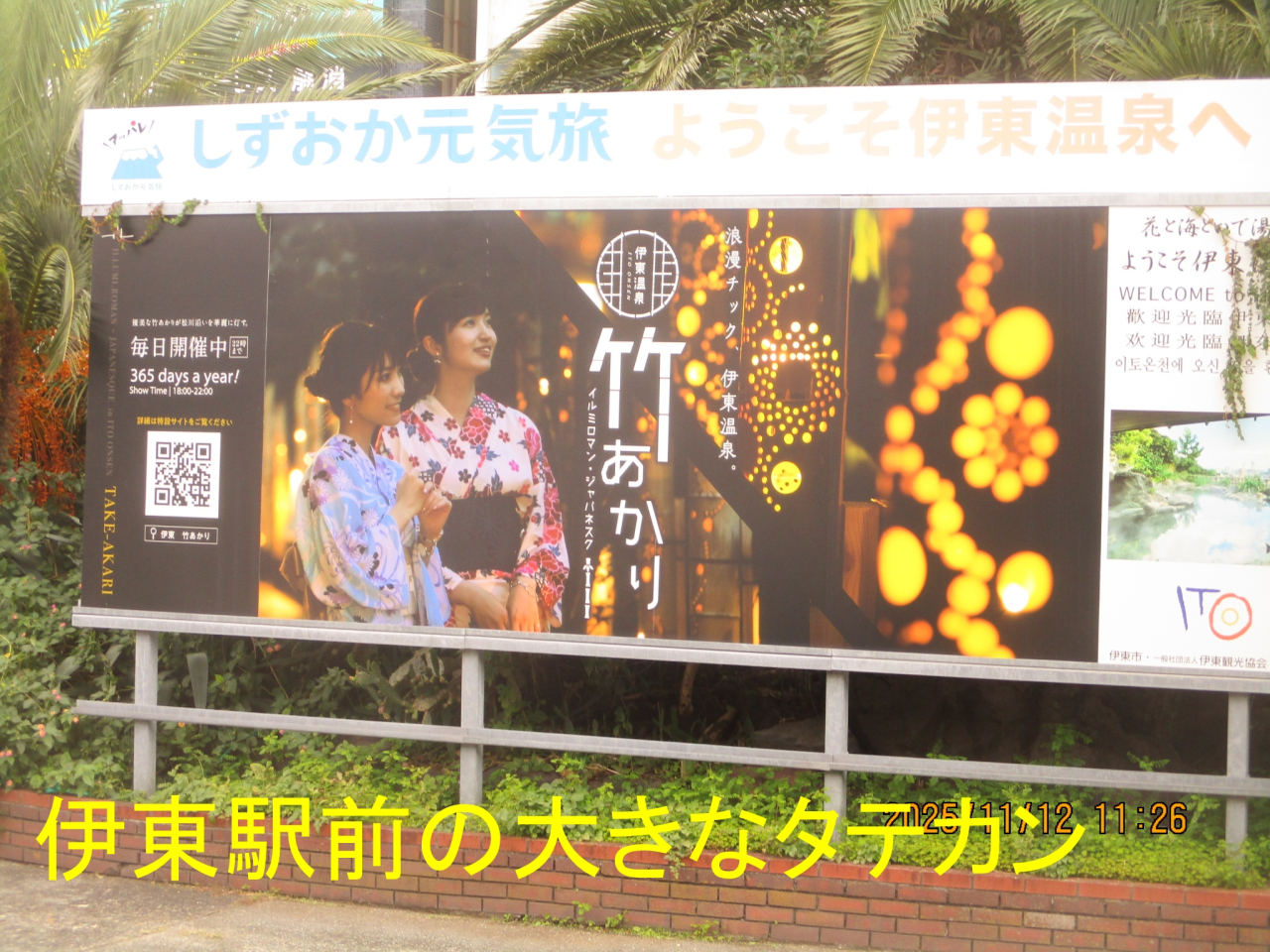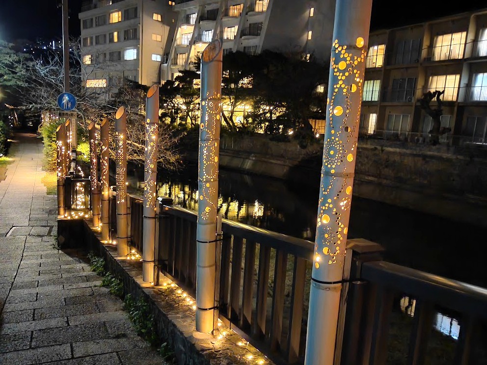 宿泊した伊東園ホテル本館は川沿いの「松川遊歩道」の反対側という立地です。松川遊歩道は「竹あかり」と呼ぶ竹細工灯篭が並んでいます。自身で竹細工を行う会員は興味津々、ホテルの窓からの景観に飽き足らず、傍まで観察に出かけました。