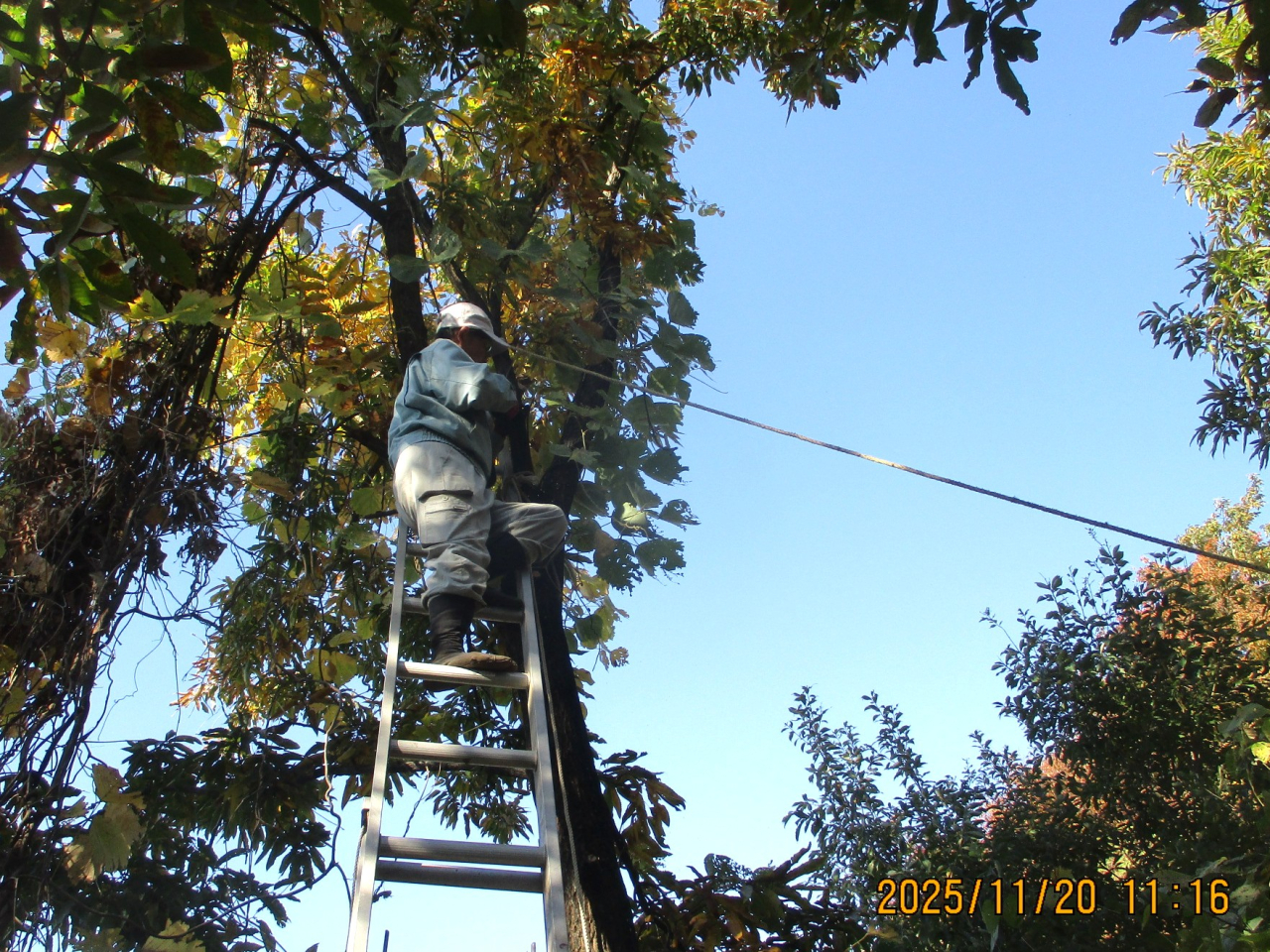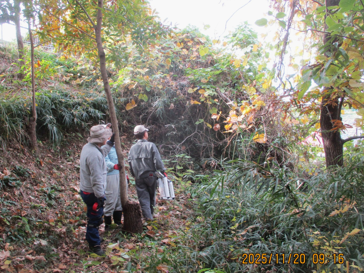今年も第三京浜横のクヌギ3本を間伐する予定です。どのクヌギを伐採するか調査し、一番難しそうな急斜面に生えているクヌギが対象になりました。絶対に第三京浜側へ倒れないように周到な準備が必要です。枝打ちし絡まっている蔦を出来るだけ外しました。伐採は12月4日の予定です。