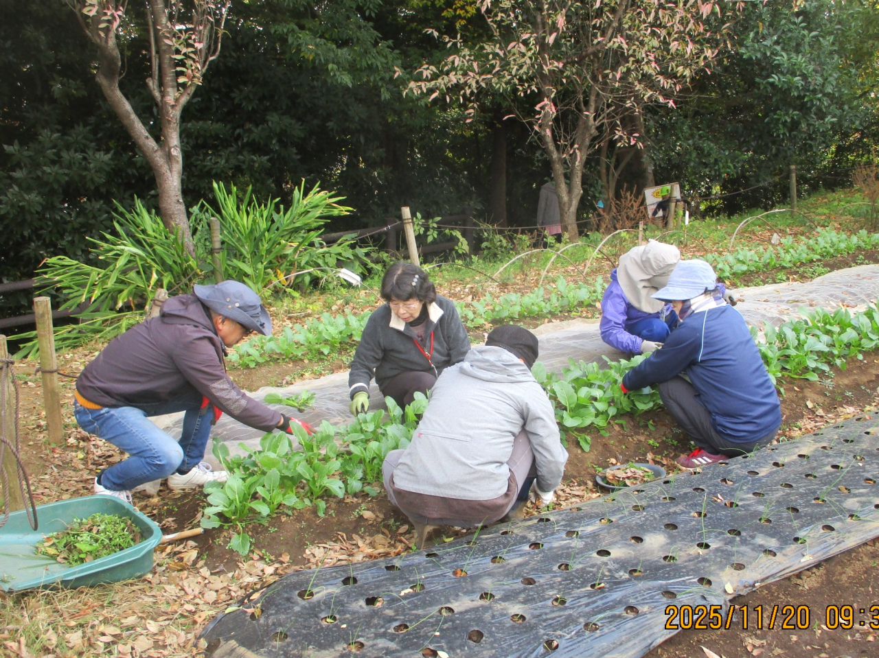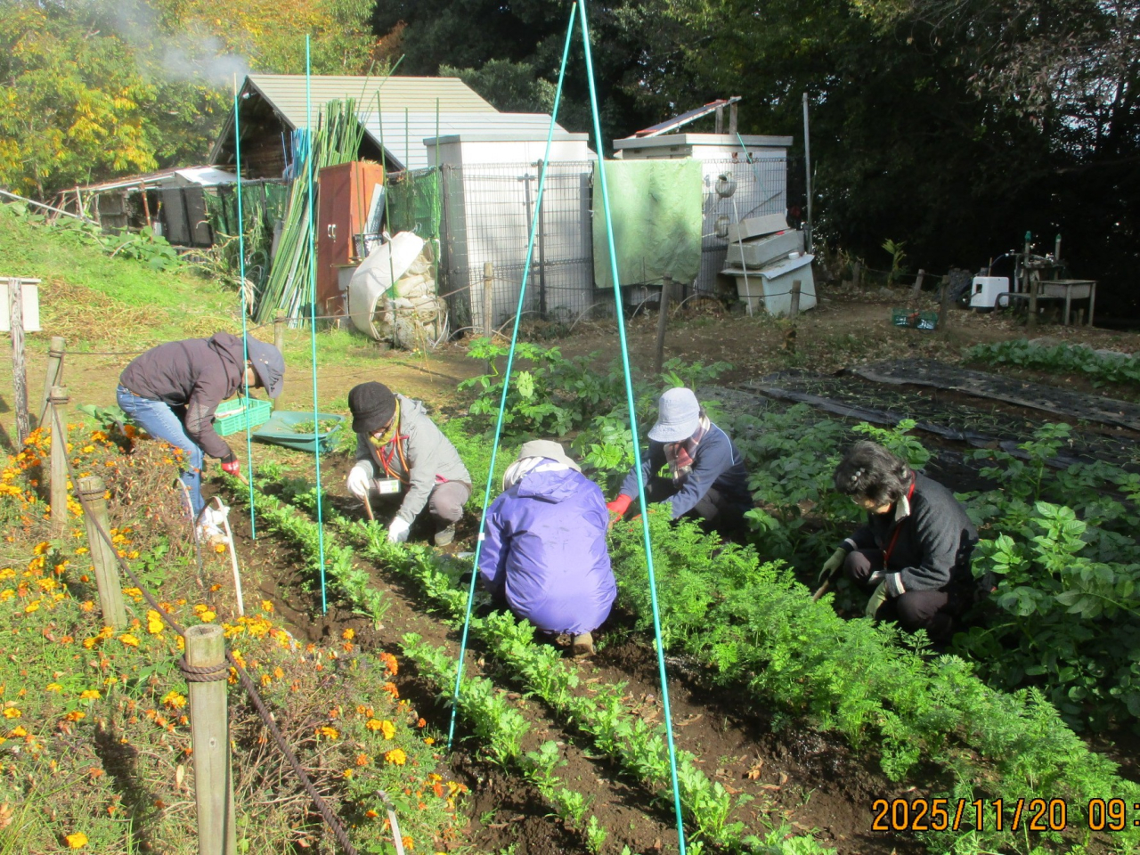 本日はニンジンの間引きや周囲の草取り、小松菜の手入れ、水やりなど炭焼き小屋横の畑のお世話です。
