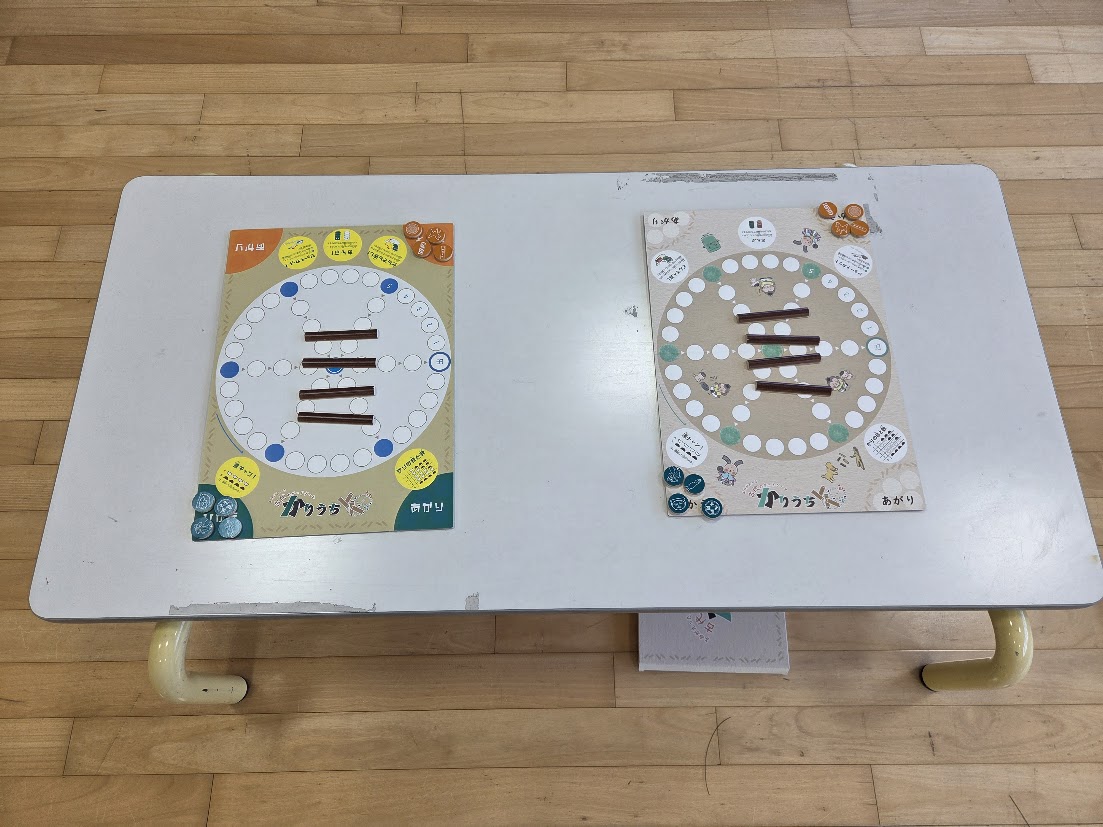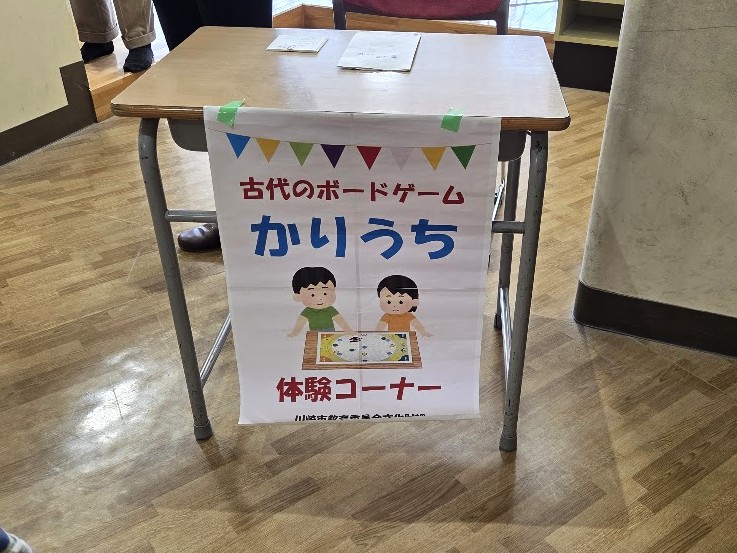 私たちの部屋の隣では「かりうち体験」のブースが設けられていました。川崎市教育委員会が担当です。「かりうち」とは初めて聞いたので、始まる前に上がり込み、少し担当の方から話を聞けました。「かりうち」とは1000年以上前の奈良時代に上流階級の間で流行した「すごろく」のような遊びだそうです。写真で見える4本の黒い(裏は白)棒状の「かり」をサイコロのように振って駒を進めてゴールを目指すそうです。当時はこれを使って賭けが行われていたそうで、中には自分の妻を賭けた強者がいたという逸話も残っているそうです。川崎市教育委員会は千年に橘樹官衙遺跡群があるからなのか、奈良平安時代の文化風俗の研究をしているようです。夏の橘ふるさと祭りでも奈良平安時代の服装などの風俗を毎年解説付きで展示しています。今回は「かりうち」を教えてもらえました。