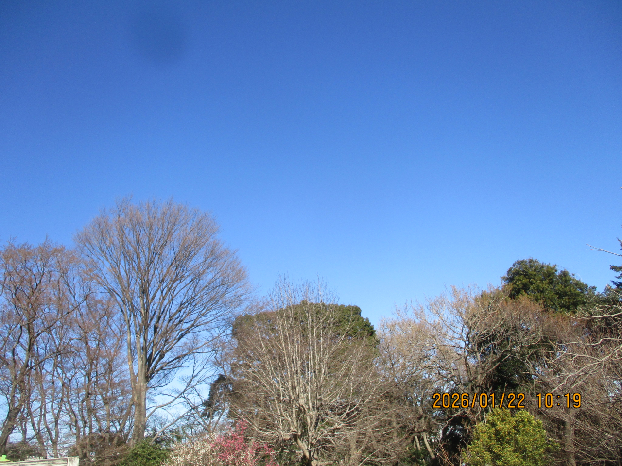 20日が大寒、暦の上では一番寒い時です。本日は暦通りに冷え込んだ活動日です。素晴らしい青空が広がっていました。写真は作業小屋から西の空です。