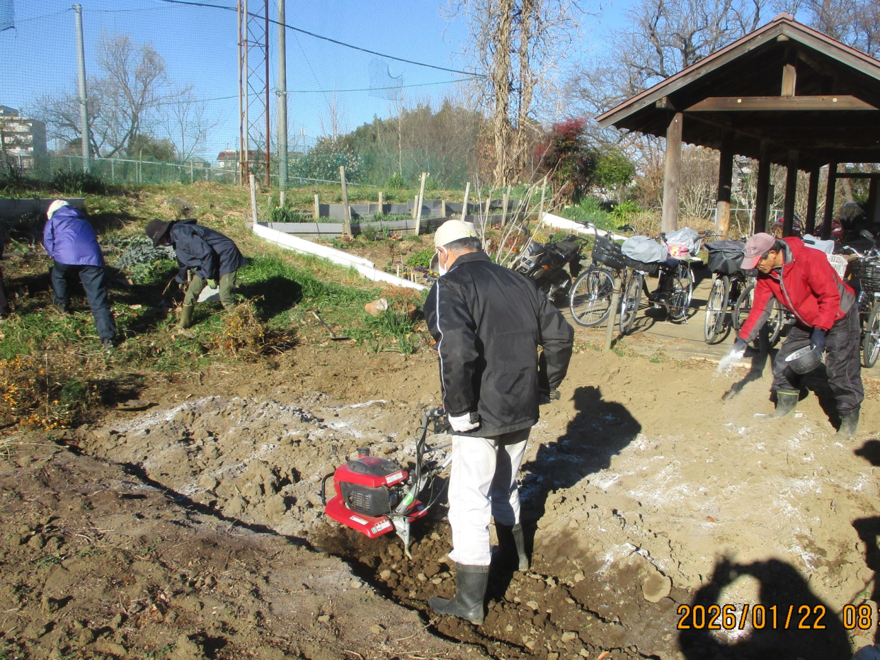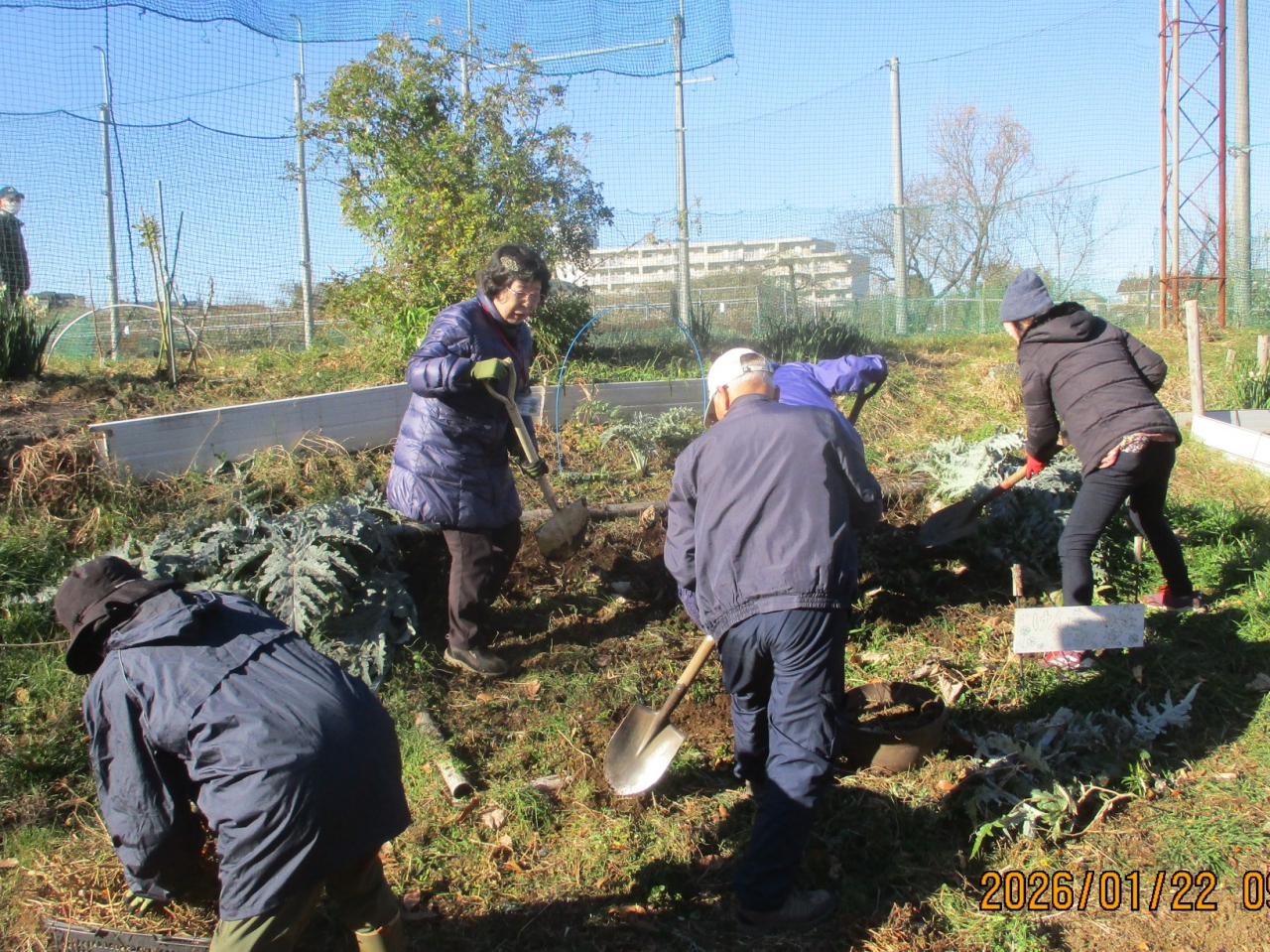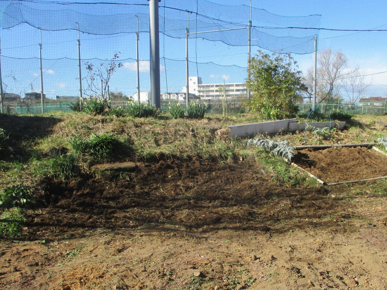 昨年の「土利用教室」で子供たち用に新設した花壇を整備しました。残っていた花を片付け、スコップで耕しです。又、花壇として使うでしょう。花壇手前のジャガイモ植付予定の畑は苦土石灰を蒔いて耕運です。