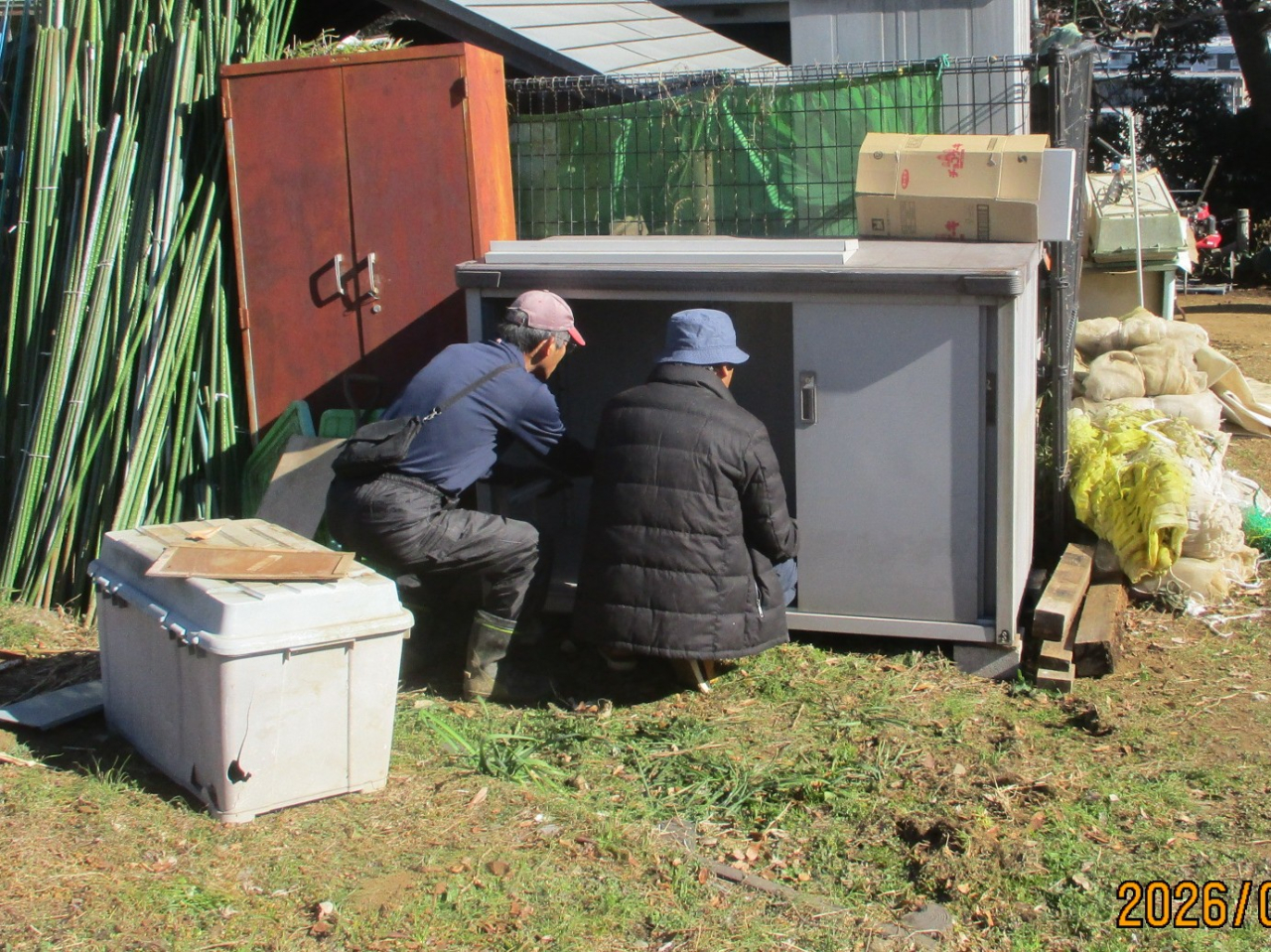 軽トラが使えるので杉山さんから申し出があり頂いた倉庫を運びました。炭焼き小屋の裏に設置、園農部会で重宝するだろうと思います。杉山さん、ありがとうございました。