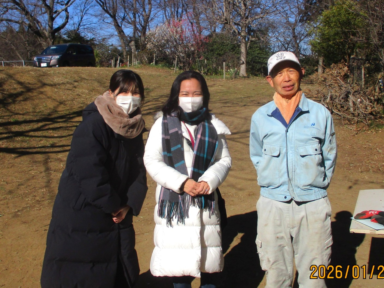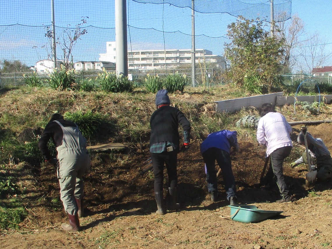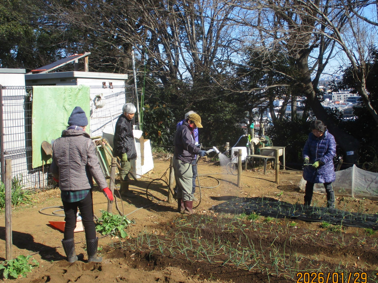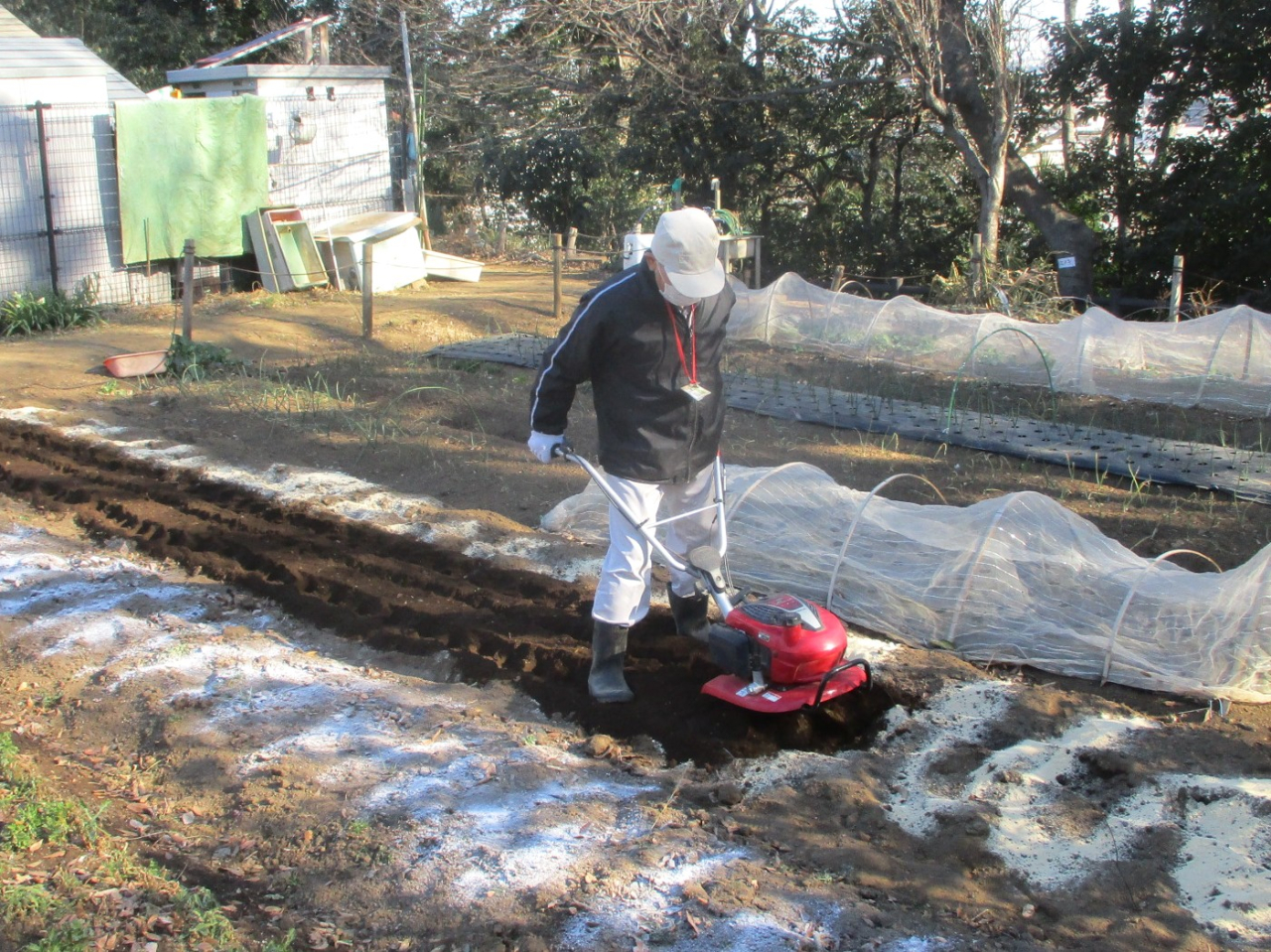 畑作業ではジャガイモ畑の耕運機による耕しです。米ぬかを入れています。サツマイモ畑とグラウンドの間に作った新しい畑はシャベルで耕しです。タマネギには水やり。