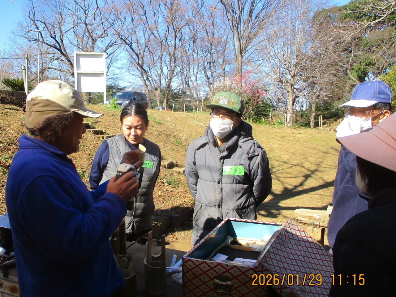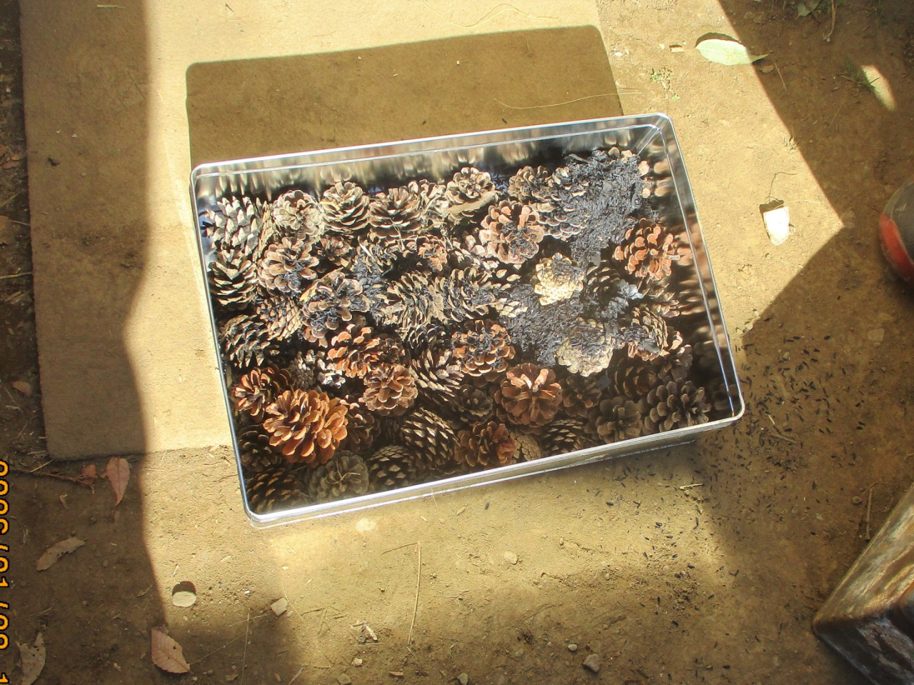 来週の炭焼きでは煙突設置後に少し時間が出来ます。その時に花炭焼きと竹工作を楽しんでもらう予定です。準備として花炭焼きは菓子箱に松ぼっくりを入れてもみ殻などで覆いました。竹工作は会員の作品を示しながら道具の使い方など事前説明です。