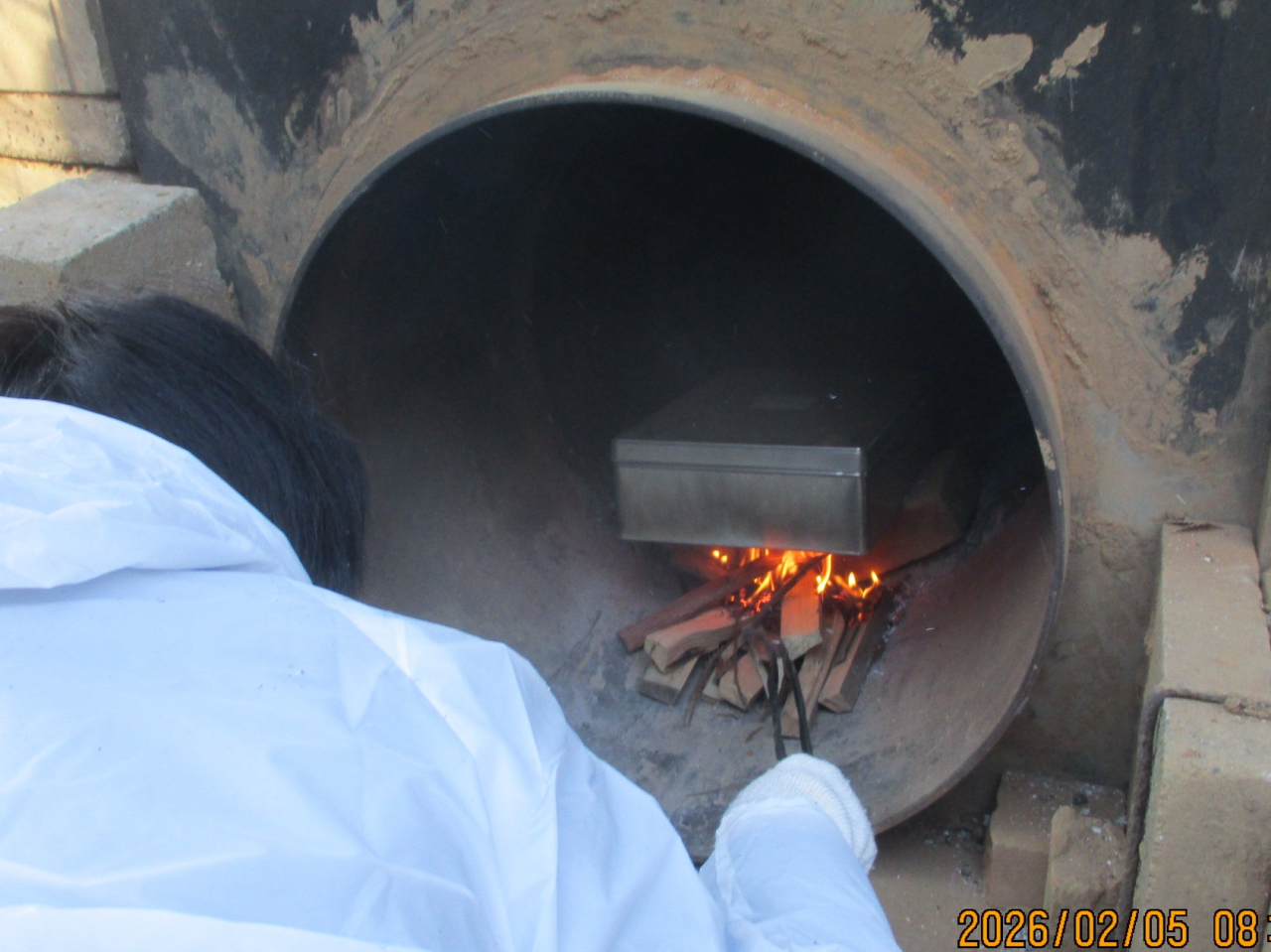 今年の受講生は熱心に参加してくれます。受講者7名全員参加、8時の点火前から3名が来てくれました。10時には煙突設置、順調に炭焼きは進みました。2号窯では菓子箱を使った花炭焼きです。先週用意した松ぼっくりにクルミも加えて8時40分頃から焼き始めました。一度お昼前に開けてみたら半分ほどしか焼けていません。少し火が弱かったかも。午後に再度焼き直しましたが炭になったようです。窯閉めは4時30分頃となりました。
