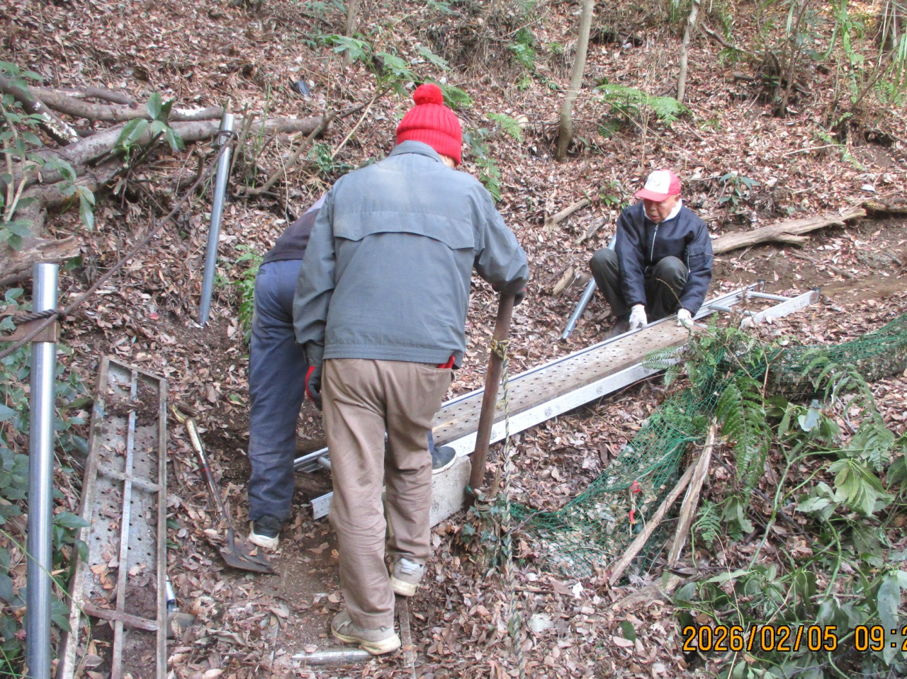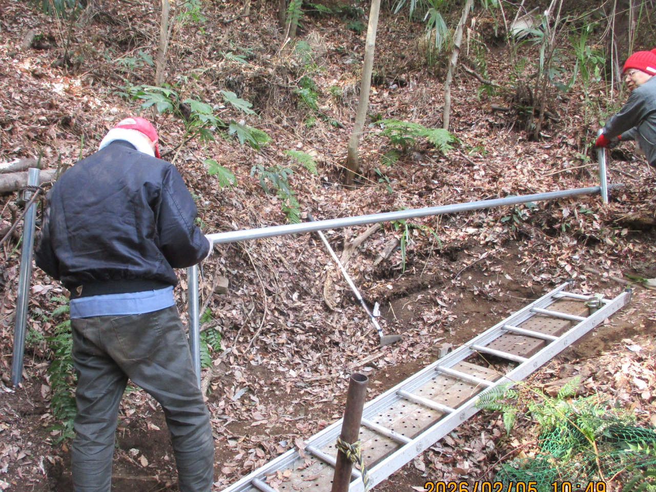 北側斜面の手作り階段、先週の続きです。修復というより階段の上の斜面に新しく梯子と敷板で道を作り、手すりも設置できました。お疲れ様でした。