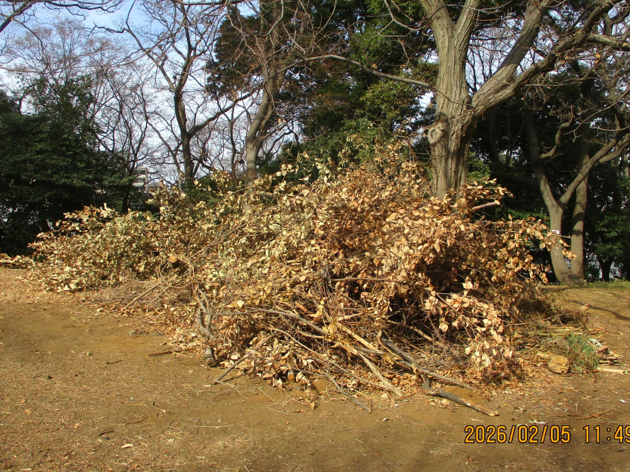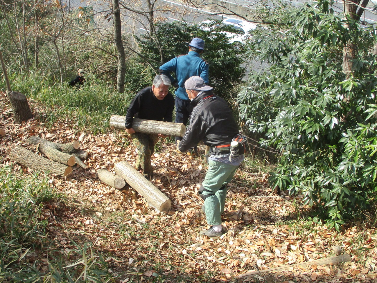 昨年11月に第三京浜横斜面で間伐したクヌギ、倒したまま乾かしていましたが上の広場まで運びあげました。重い木材を抱えて階段を登るという中々に大変な作業です。間伐した枝も上げたので不要枝置場が山になりました。