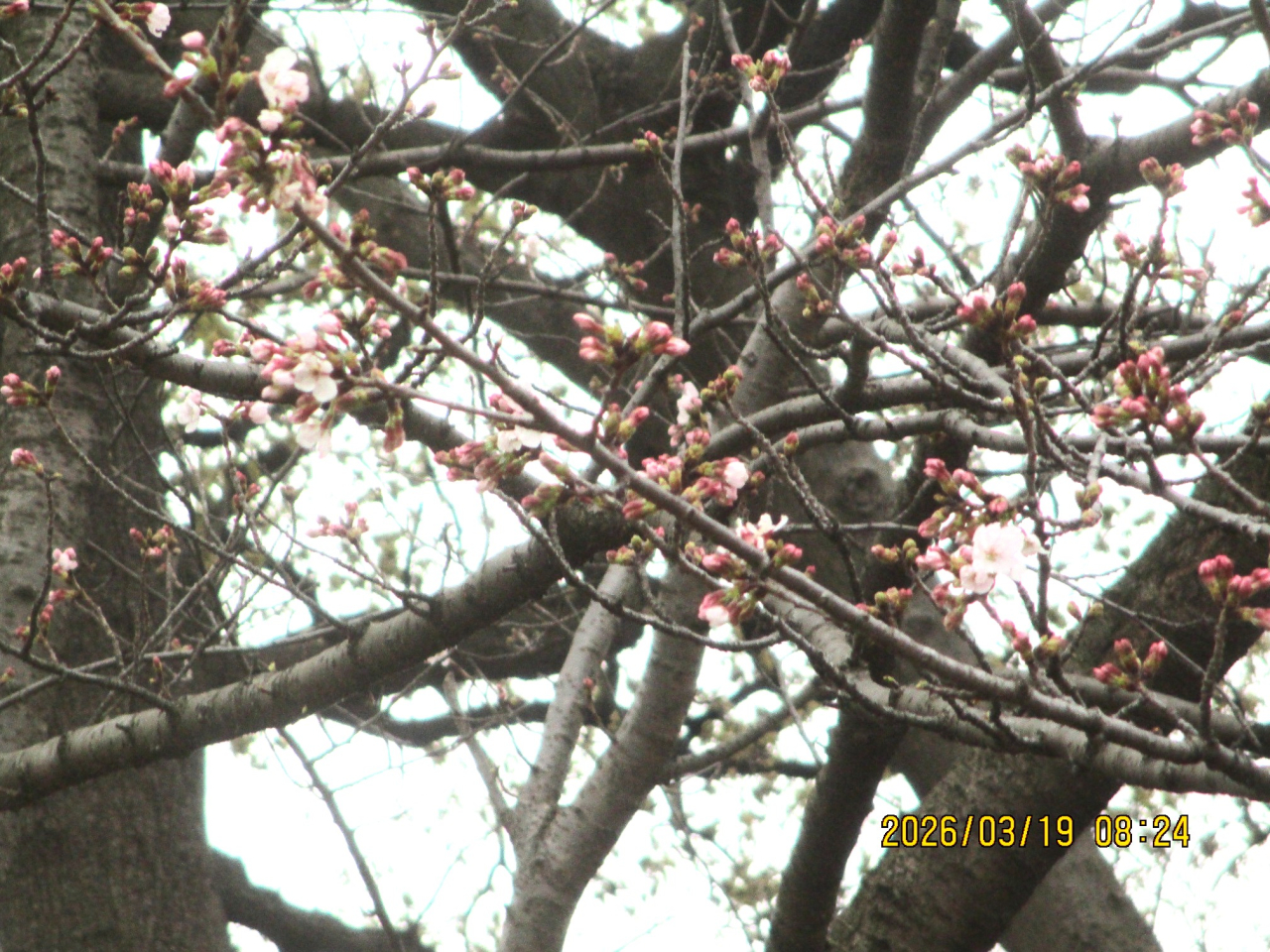 昨晩の天気予報では今日は午前中雨、作業が出来るか不安となっていましたが雨は早朝まででほとんど止み活動には支障ありませんでした。こんな天気でも19名の会員が参加してくれました。来週のお花見を控えて春日台のソメイヨシノは咲き始めています。お花見のタイミングは良さそうです。ただ長期予報では26日は小雨予報、お弁当の予約の都合もあり「小雨決行」を決めました。