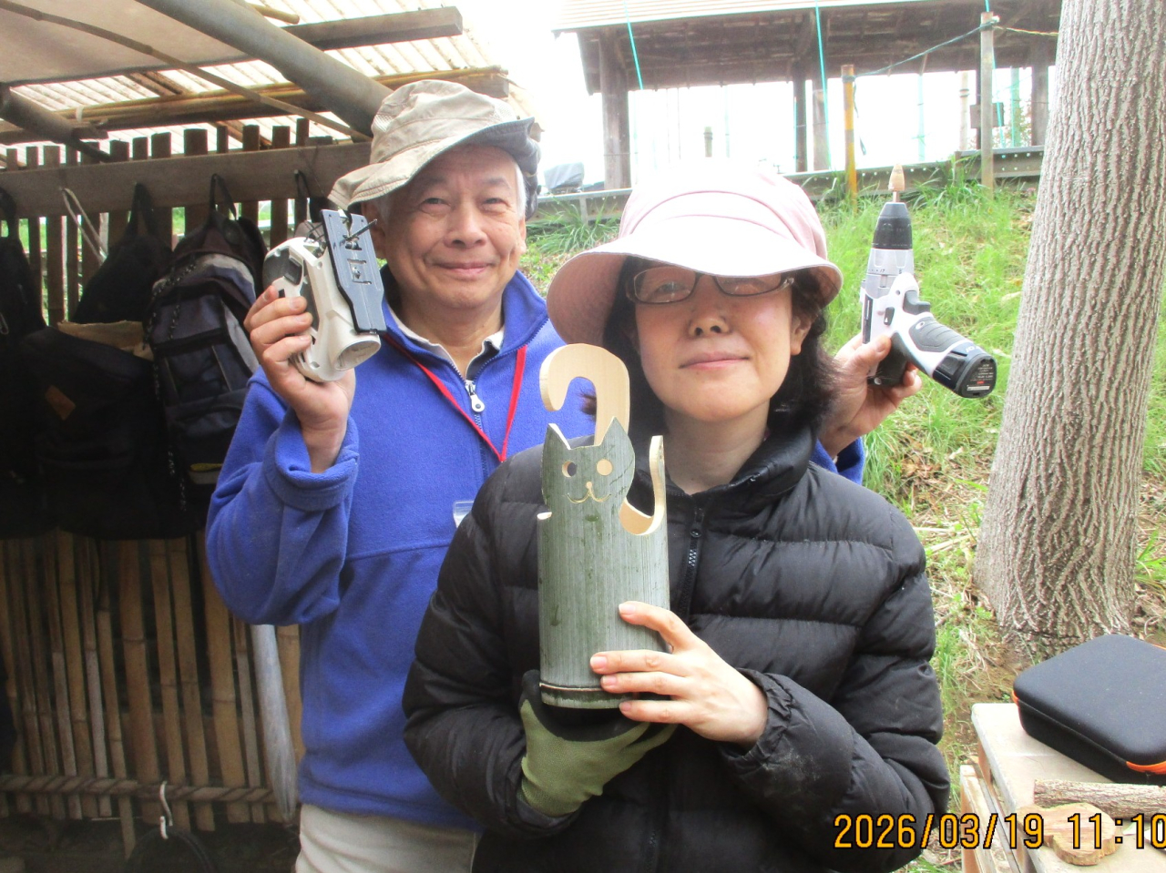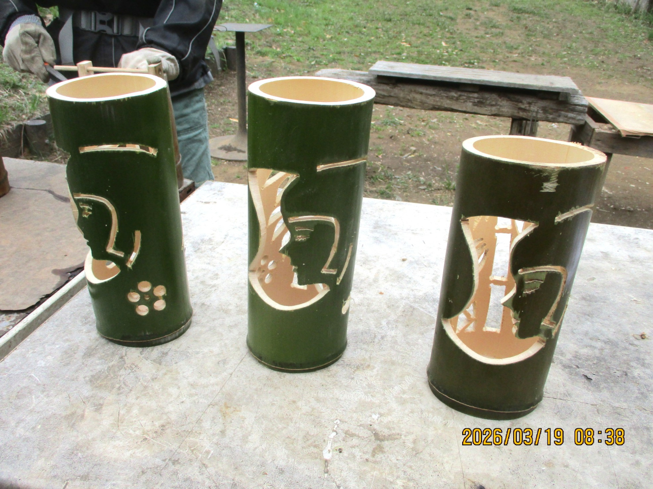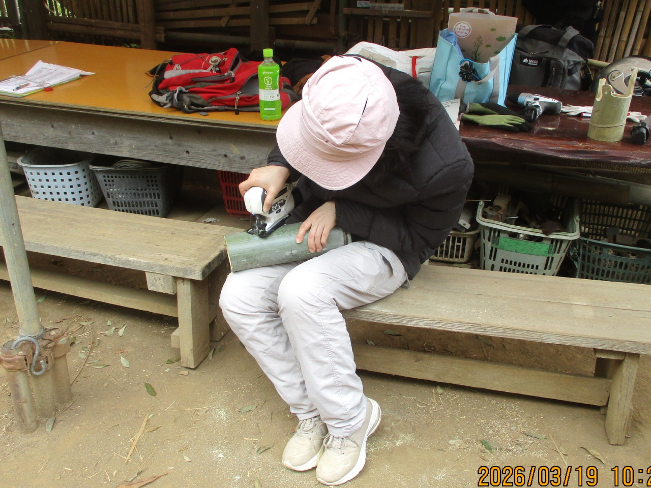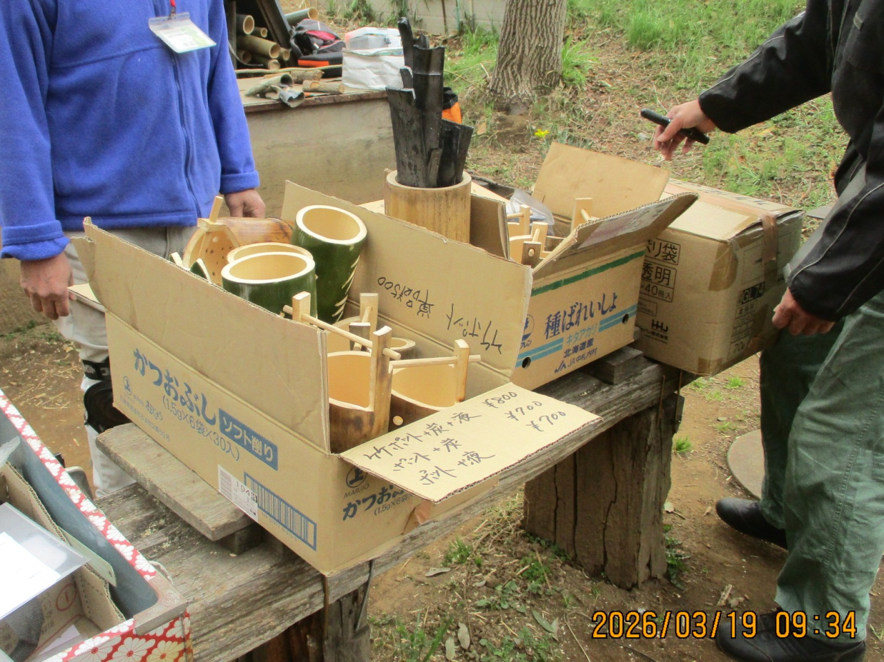 竹部会では竹ポット中心の工作です。竹炭焼き教室参加から新規入会してくれた会員も寺田部会長に弟子入り。竹工作「職人」目指して初作品を完成させました。