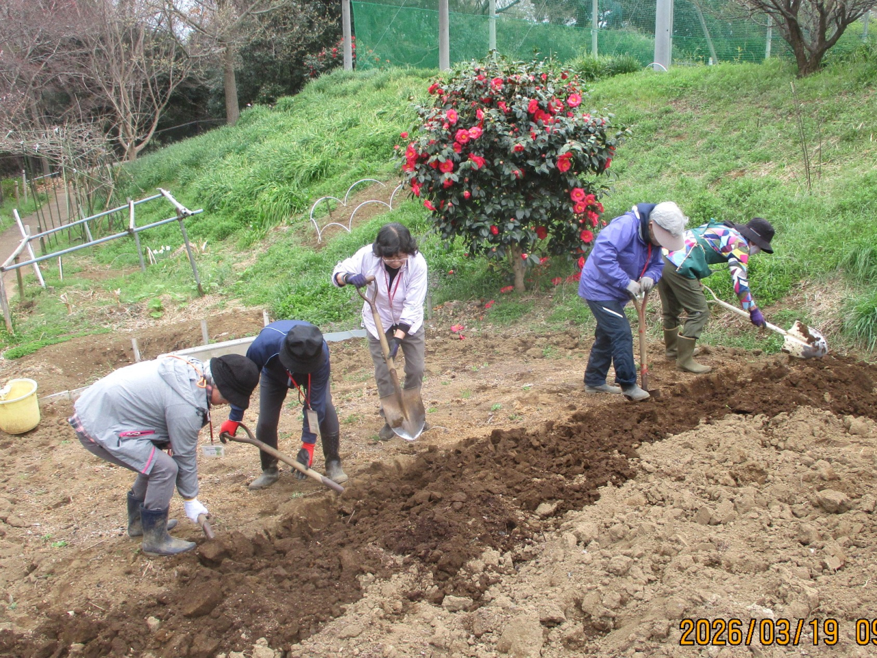 園農部会では春菊をすべて抜いて直後に耕運機で耕運、ここへはヤーコンを植えるそうです。サツマイモ畑は先週の続きでシャベルでの耕運、シャベルで耕運機を使うよりも深く耕す事が出来ます。春菊とノラボウナは会員へ提供してもらえました。