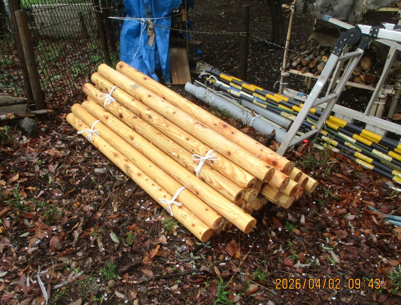道路公園センターさんより、立派な木杭を30本ほどいただきました。 今後の整備に大いに役立ちます。