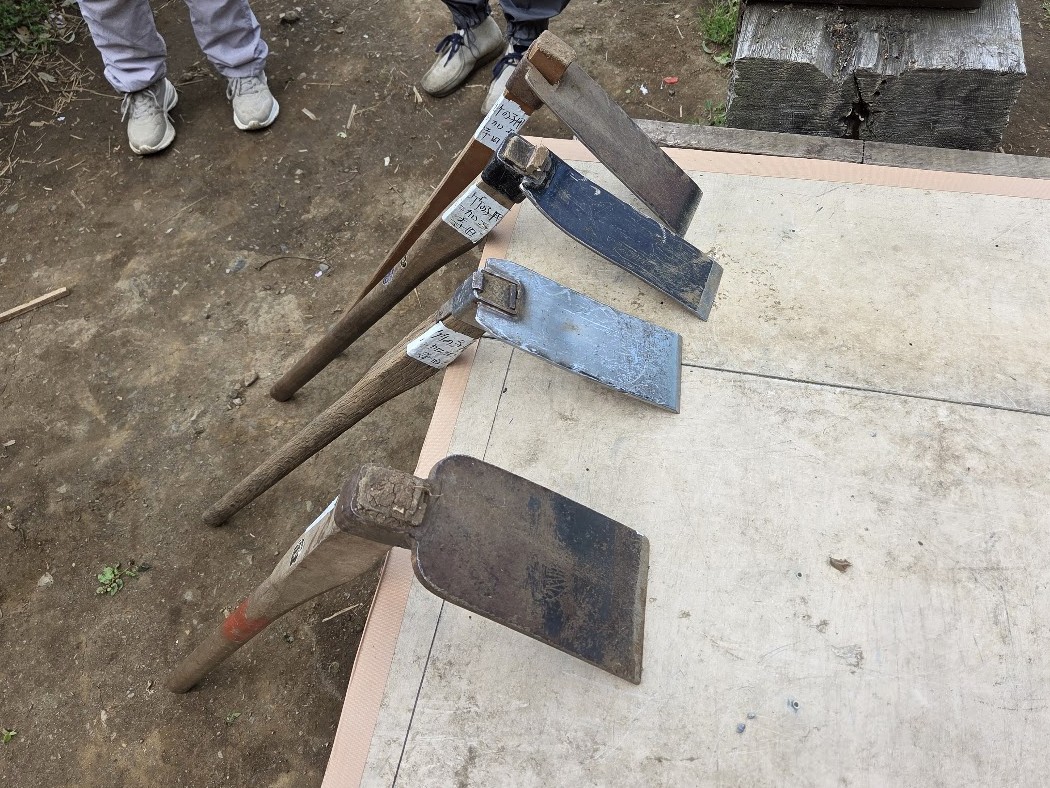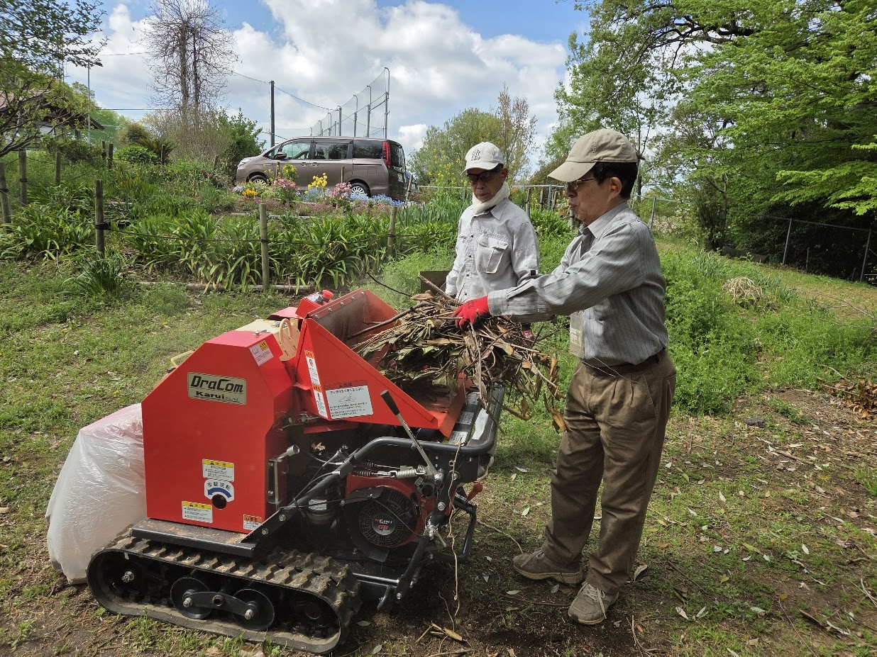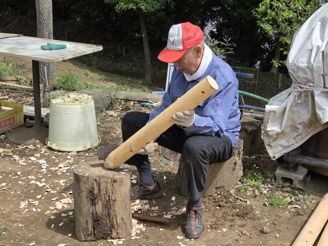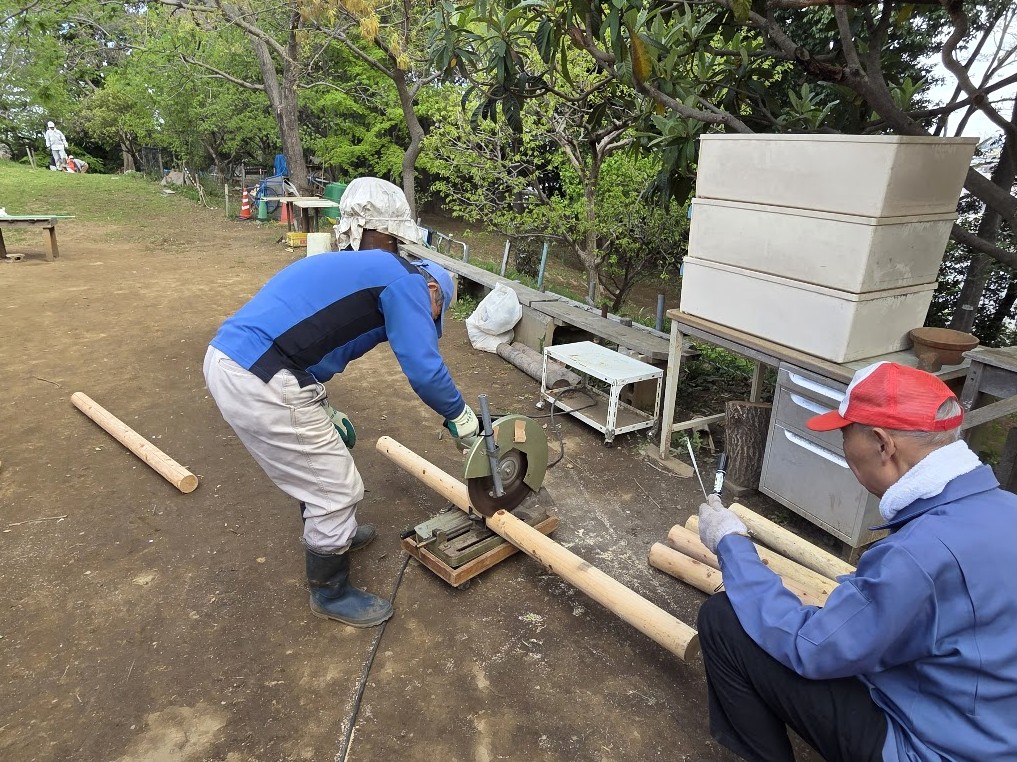 道路公園センターからいただいた長い木杭を切断し、短い杭として再利用できるよう加工しました。園路整備などさまざまな場面で役立つ大切な資材になります。