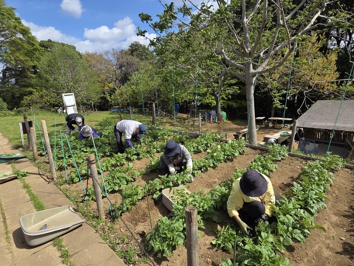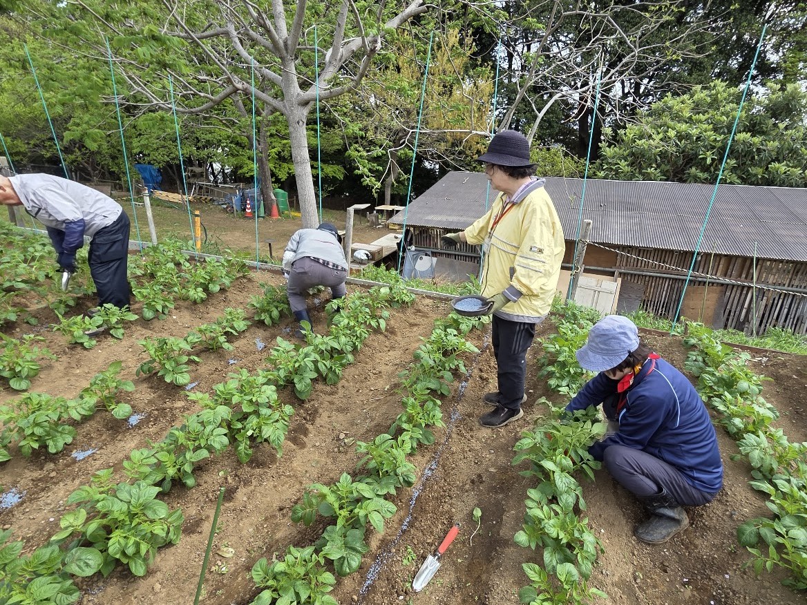 3月初旬に植え付けたジャガイモが大きくなっています。芽かきと追肥を行いました。生育状況を確かめながら丁寧に作業を進めました。
