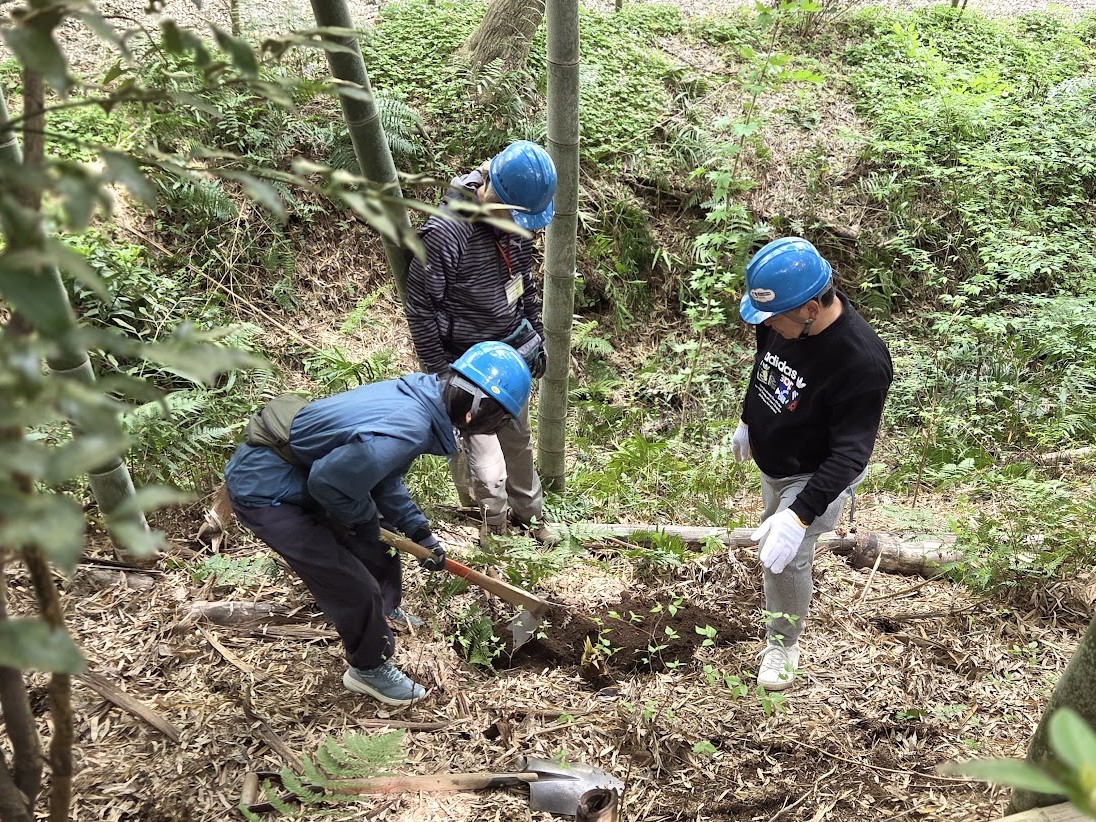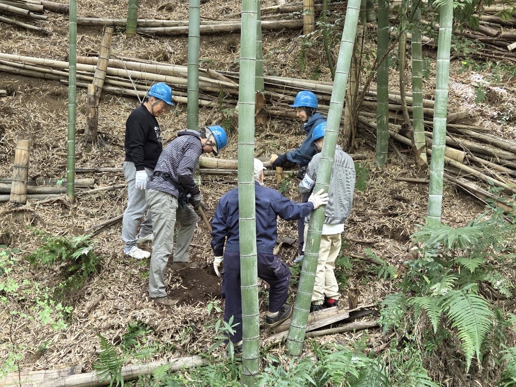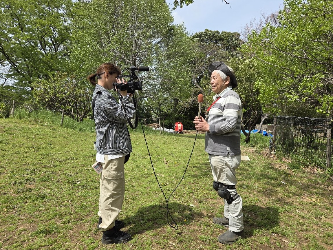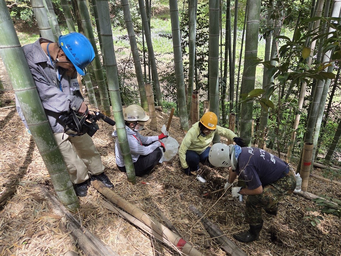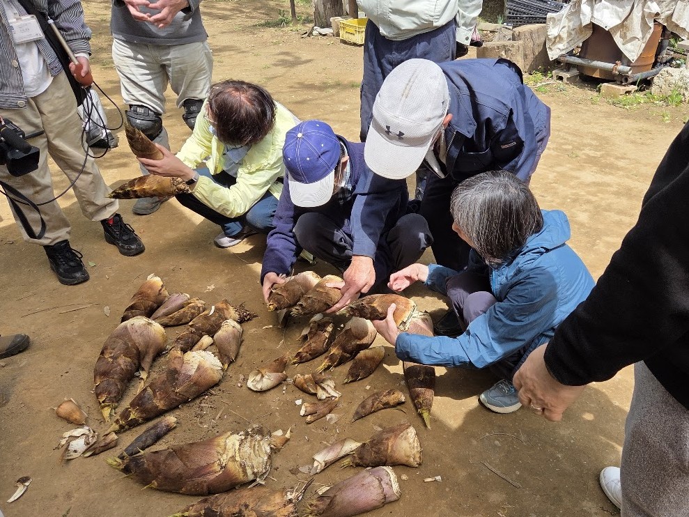 先月から始めた「里山保全体験教室」の2回目です。今日の体験は「竹林整備」この時期なのでタケノコ堀です。タケノコ用のクワは寺田さんが刃を細目に作り替えた専用クワです。ふれあいの森の急斜面で2,3人ずつ協力しながら掘り出しました。掘ったタケノコは勿論お土産、参加者の皆さんは終了後に慎重に品定めです。「イッツコム」の取材も入り、女性記者さんは参加者同様、ヘルメットをかぶり急斜面をものともせずにカメラを回し、参加者の皆さんが竹林整備に取り組む様子を撮ってくれました。終了後には本日のリーダー寺田さんへインタビュー、寺田さんは竹林整備に留まらず里山の魅力や保全の大切さを丁寧に答えていました。4月15日18時からの地元ニュースで放映予定です。地域の方々に活動を知っていただく良い機会となります。
