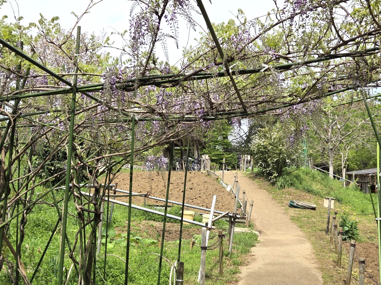 本日は3週間ぶりに雨のない活動日でした。桜が終わり、3年前から少しずつ増やした藤棚に藤の花がほころび始めました。