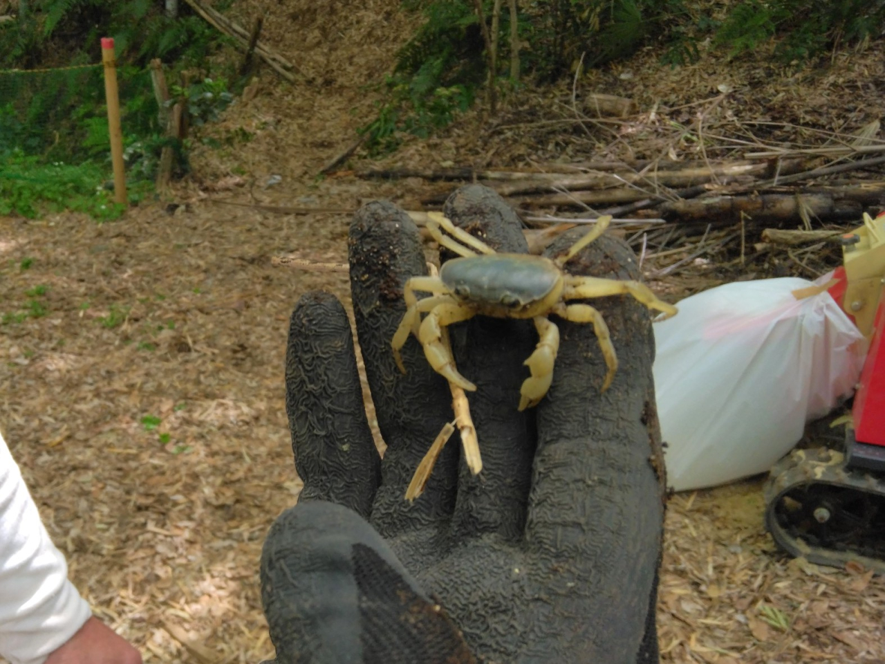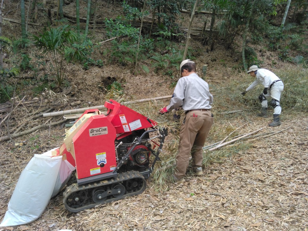 ふれあいの森で粉砕機使用して不要竹材の竹チップ化作業です。この日、寺田さんがふれあいの森で「サワガニ」を見つけました。ホタル幼虫と共存して欲しいですね。撮影は前田さん