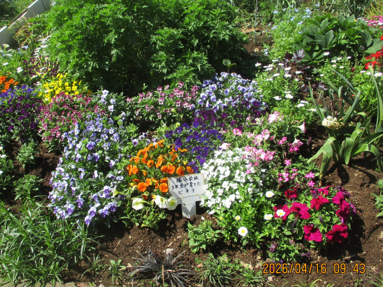 橘小学校3年生が育てたビオラが奇麗に咲いています。子どもたちが育てた苗を、私たちが引き継いで大切に育てています。